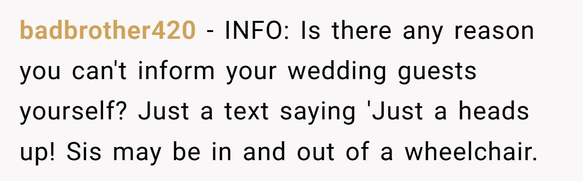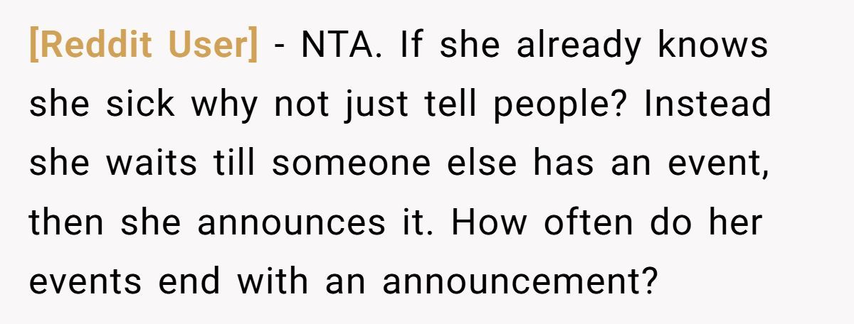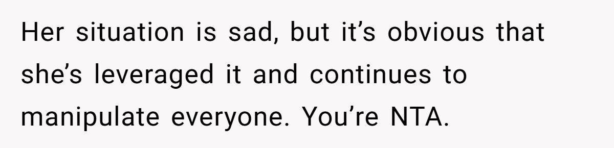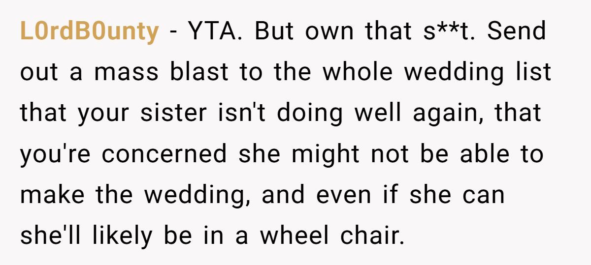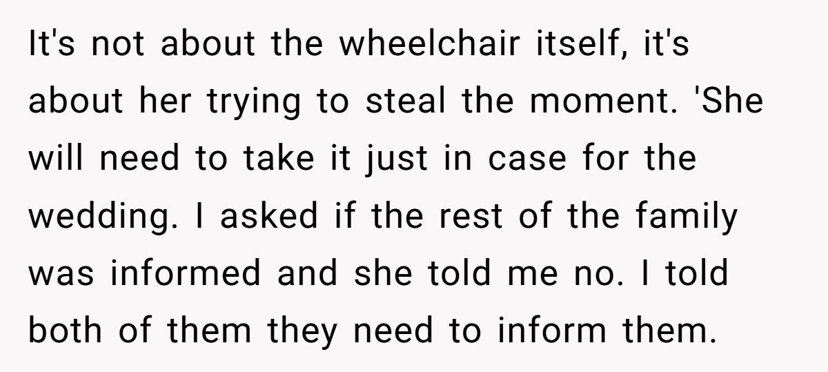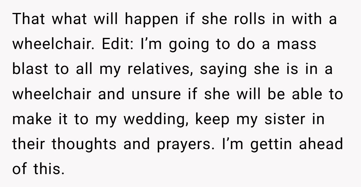 Most agreed: NTA. This isn’t about the wheelchair, it’s about your sister’s repeated pattern of stealing the spotlight. If it were a real health concern, she’d inform people ahead of time. Many believe she’s planning another dramatic moment.