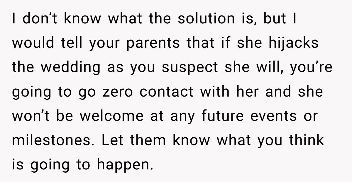 Some advised OP to calmly set boundaries with their parents, others suggested warning guests directly, while one sarcastically said to own being the AH and control the story.
