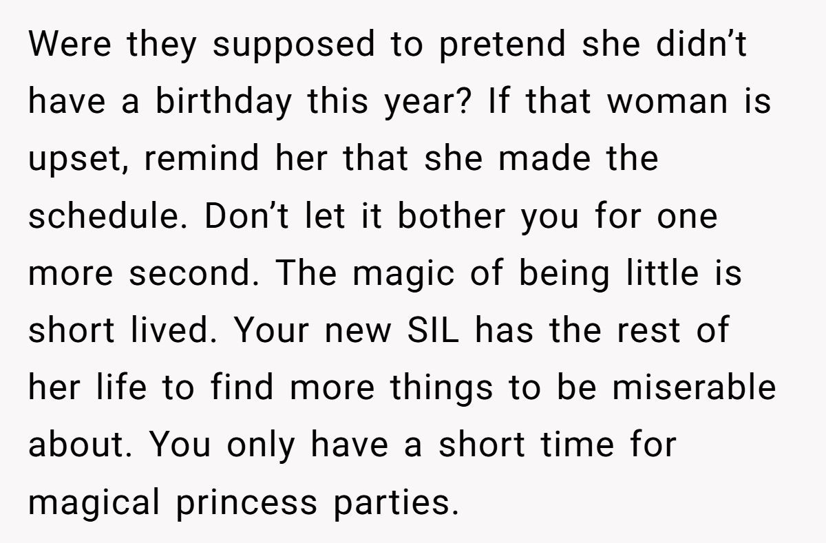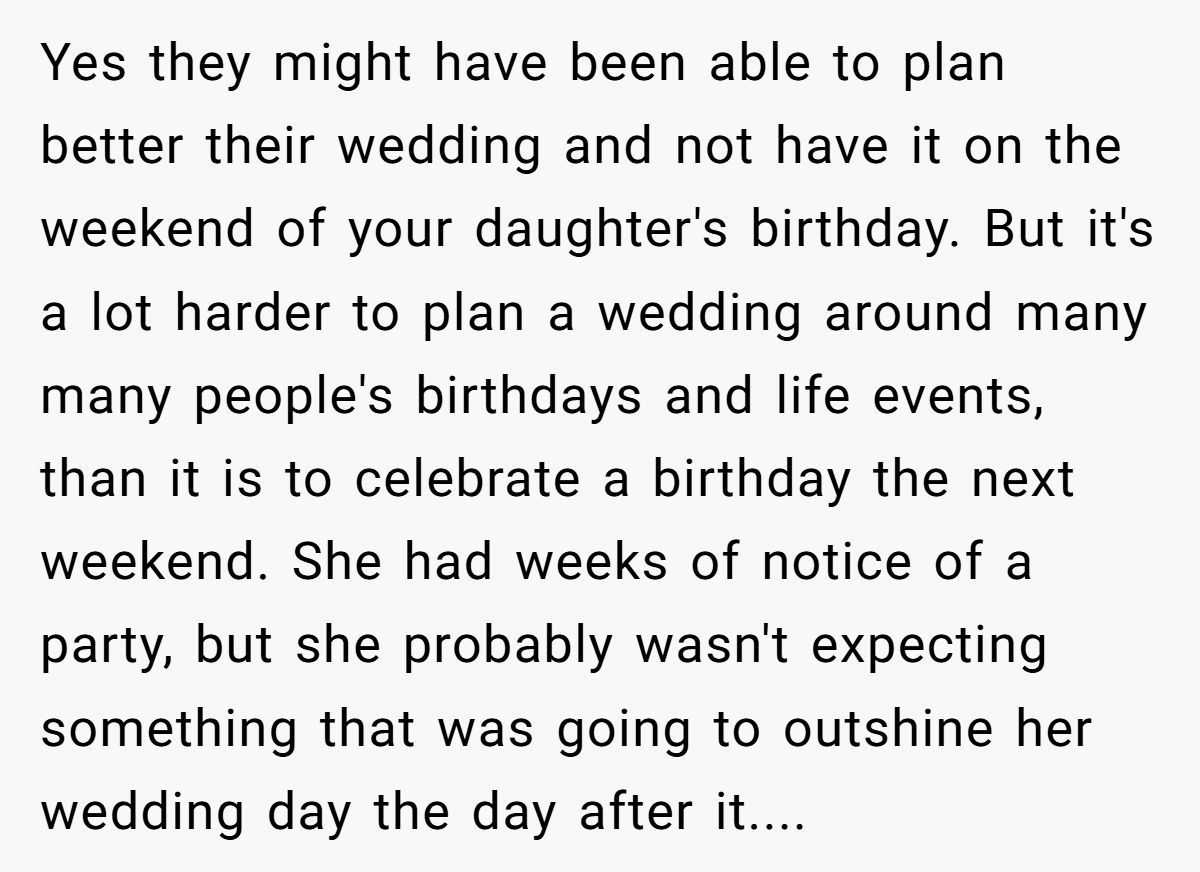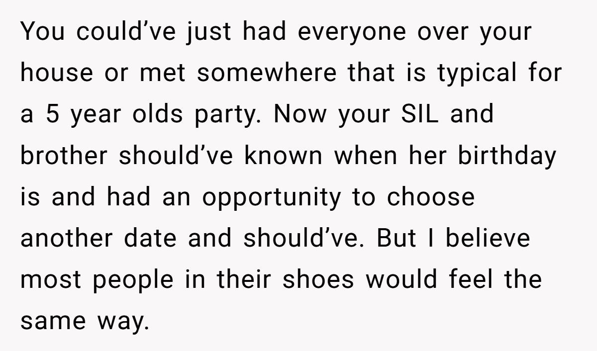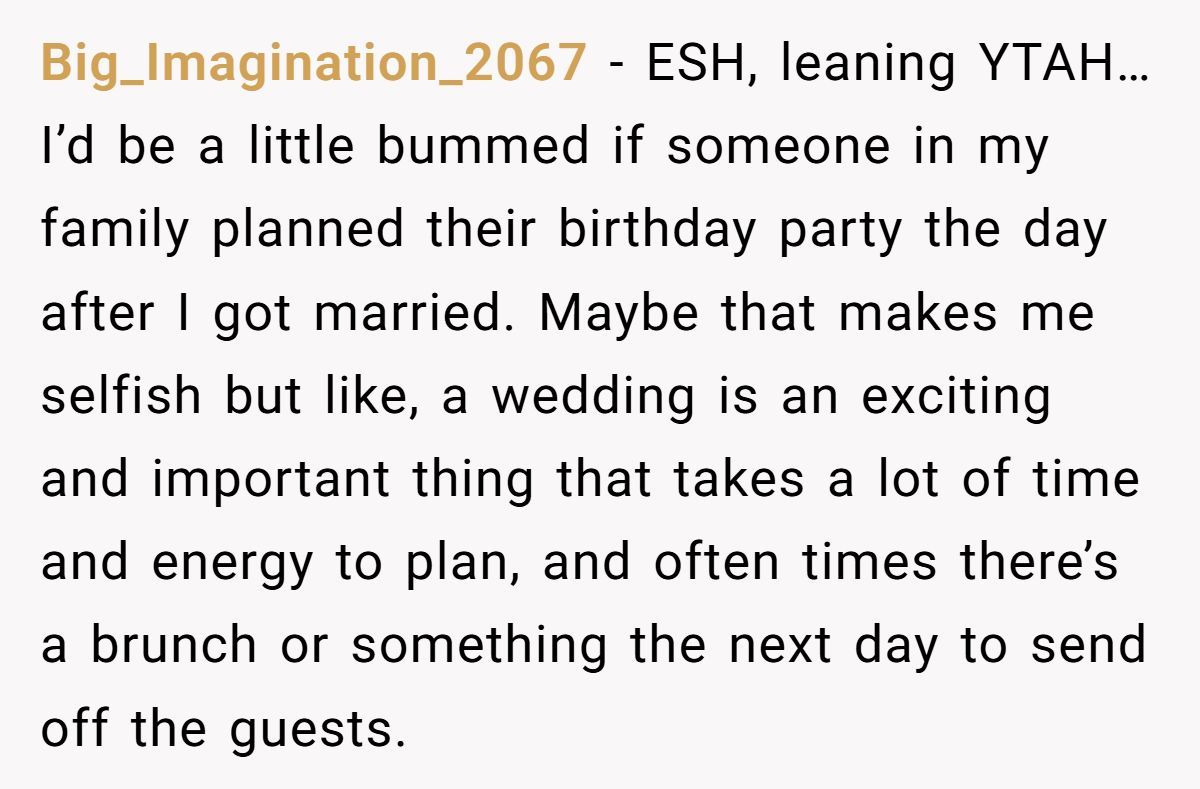 Some saw fault on both sides—the SIL for not planning around the birthday, but the Redditor for going overboard without consulting the bride