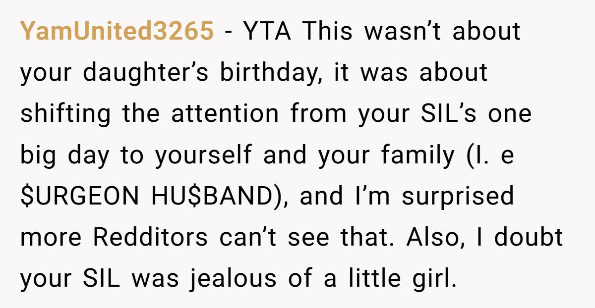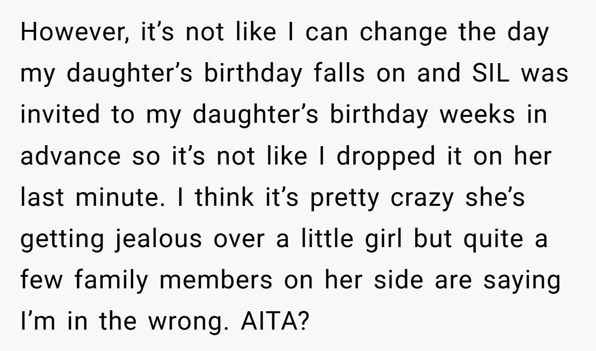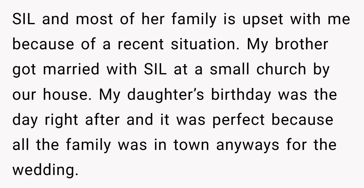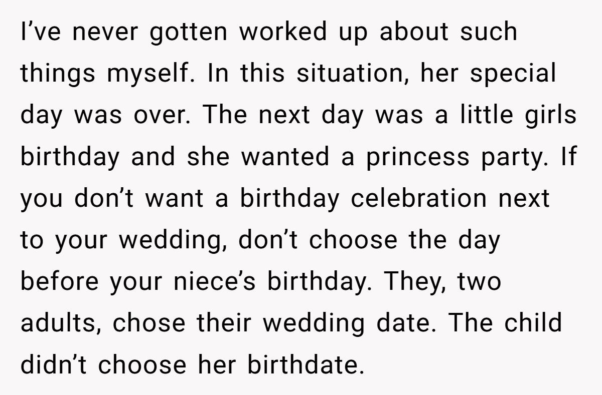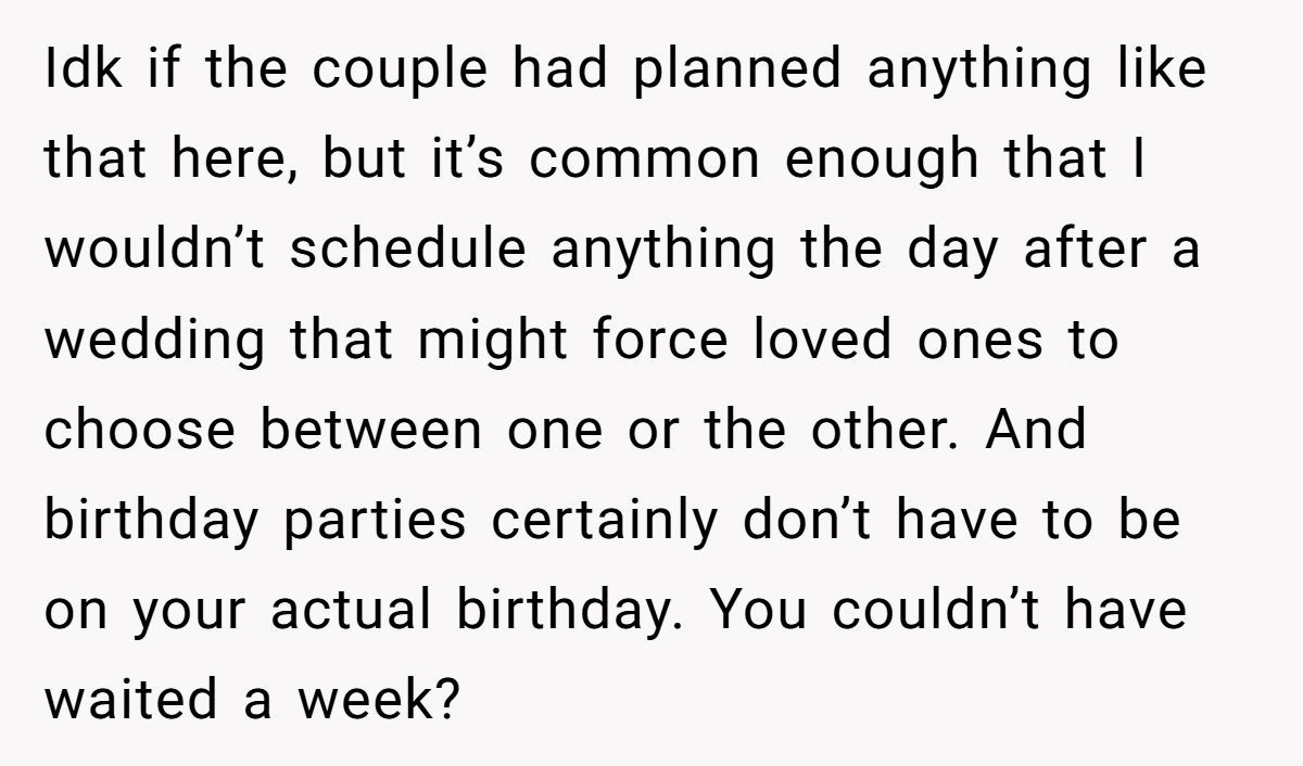 Some saw fault on both sides—the SIL for not planning around the birthday, but the Redditor for going overboard without consulting the bride