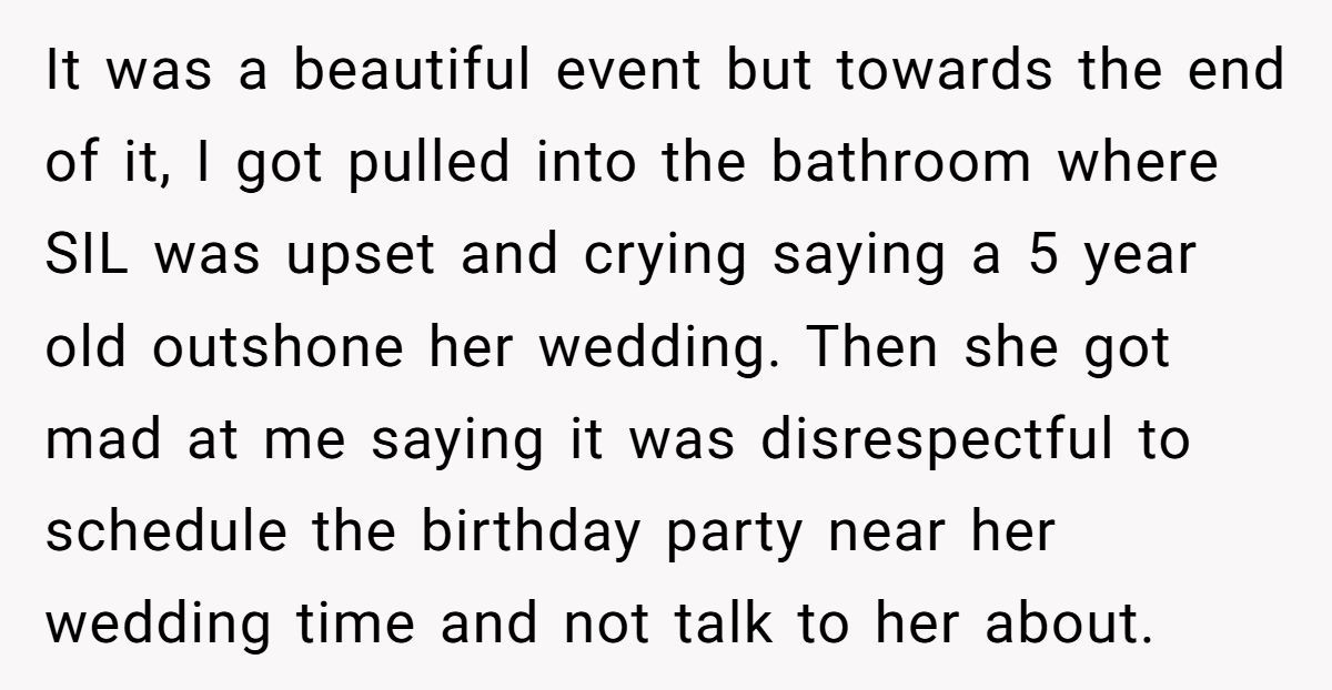 This Redditor, thrilled to celebrate her daughter’s 5th birthday with a princess carnival at a fancy garden venue, didn’t expect her SIL to cry foul for outshining her small church wedding the day before. With family already in town and the SIL invited weeks in advance, the Redditor saw it as a convenient celebration, not a slight. But the bride’s hurt and her family’s backlash suggest a clash of expectations.Wedding etiquette is a minefield.