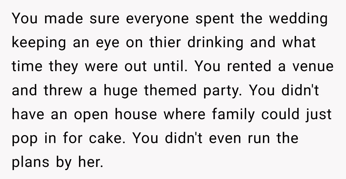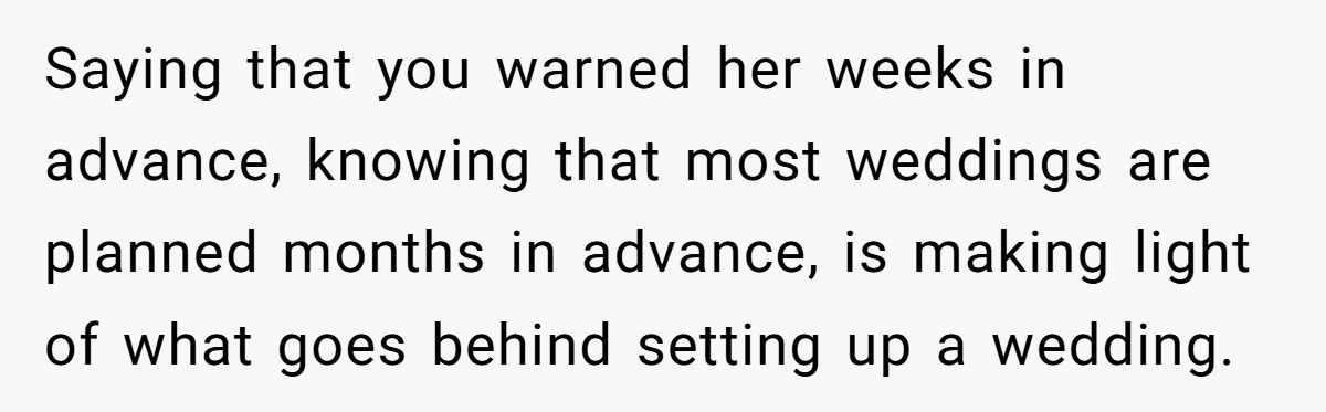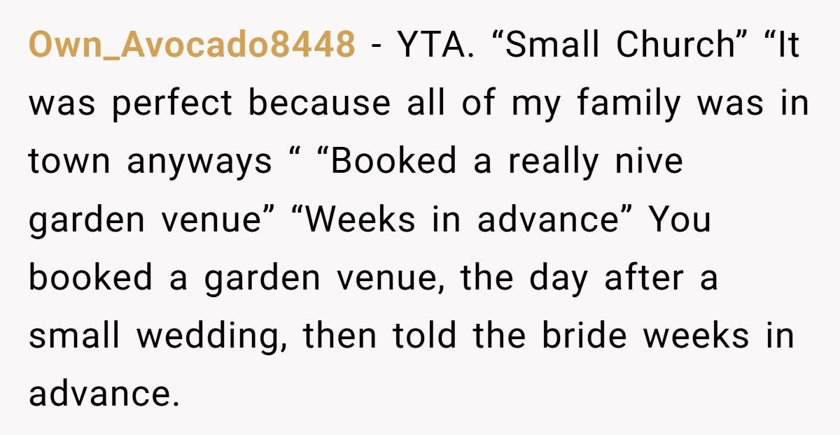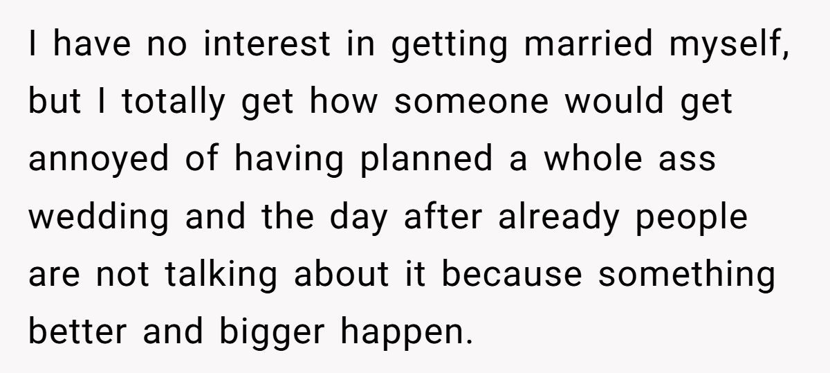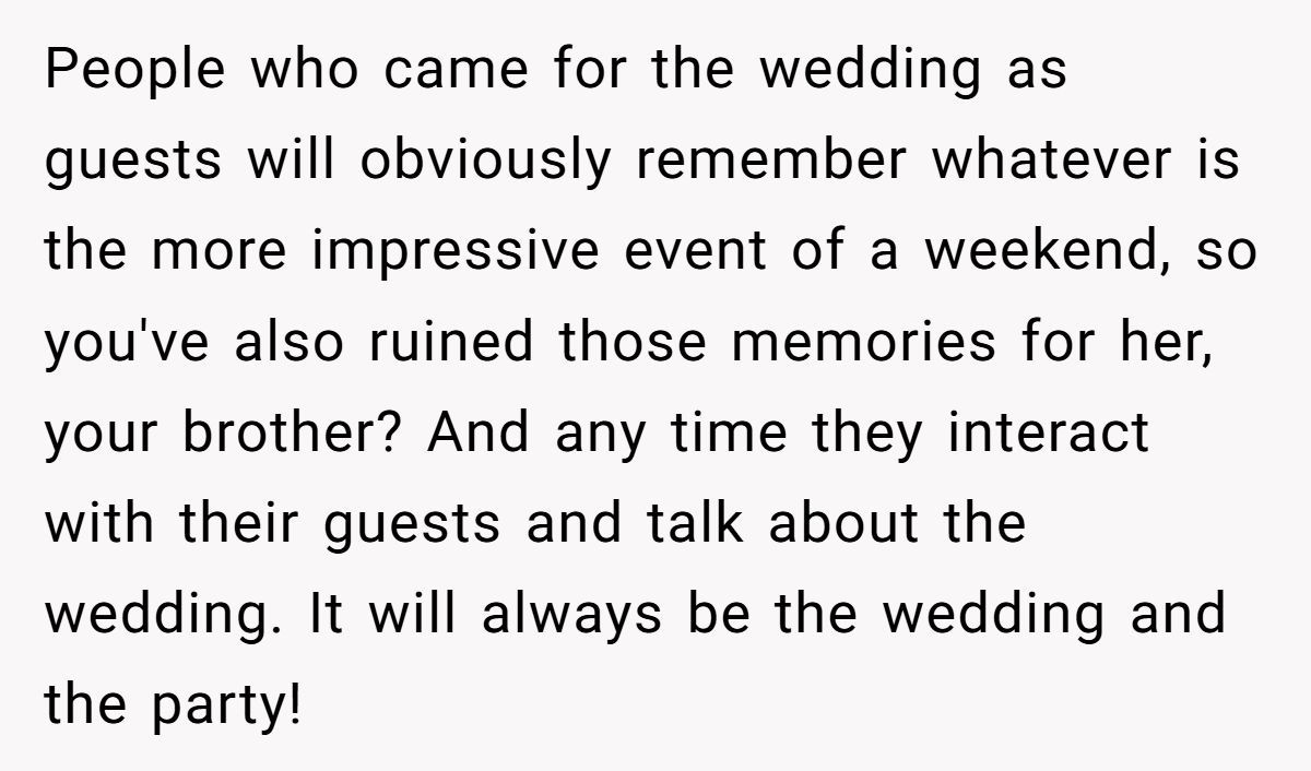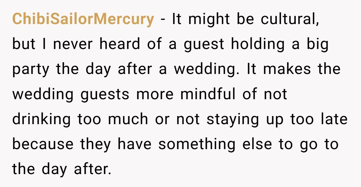 These commenters noted the Redditor’s failure to discuss plans with the SIL, saying the lavish party’s timing forced guests to limit wedding fun