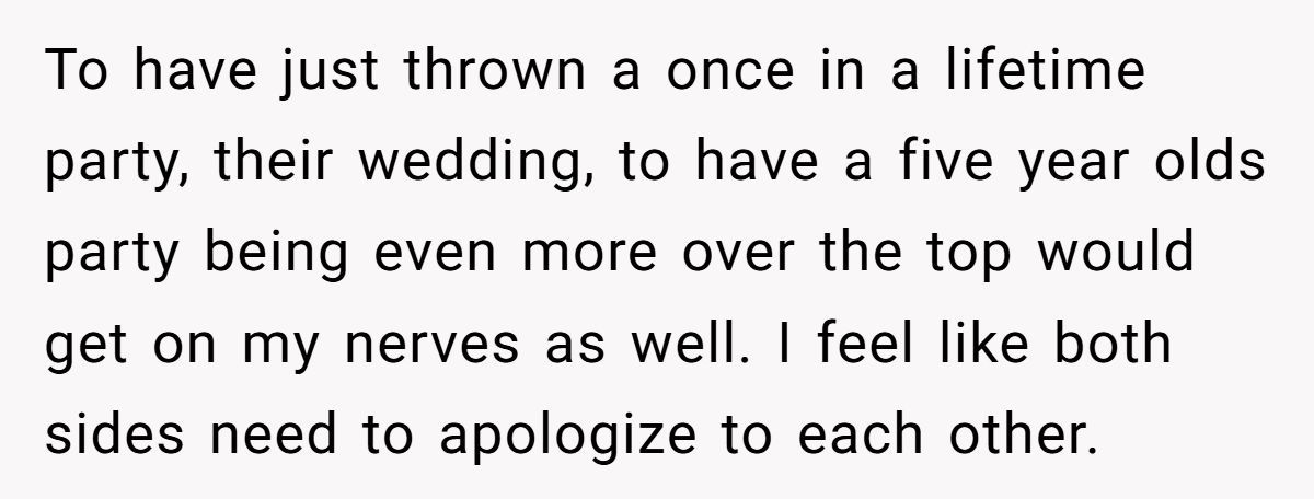 How to mend this? A sincere apology for unintentionally dimming her SIL’s glow, perhaps paired with a thoughtful gesture like a family dinner to celebrate the newlyweds, could bridge the gap. Moving forward, checking in with key family members before big events can prevent hurt feelings. Opting for a simpler party or shifting it a week later might have softened the clash. Readers, how would you balance a child’s milestone with a family wedding’s spotlight? Share your thoughts below!