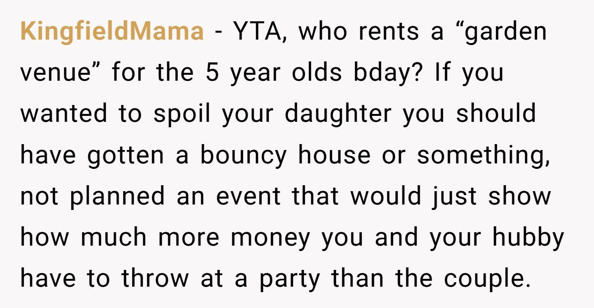 These users claimed OP was wrong and criticized the extravagant garden venue as excessive for a 5-year-old