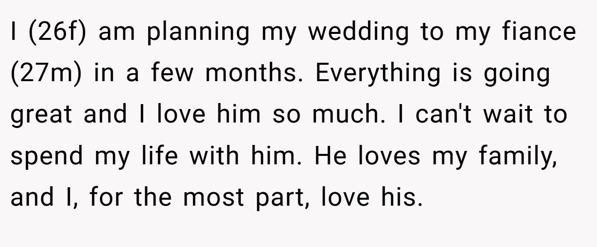 I (26f) am planning my wedding to my fiance (27m) in a few months. Everything is going great and I love him so much. I can't wait to spend my life with him. He loves my family, and I, for the most part, love his.