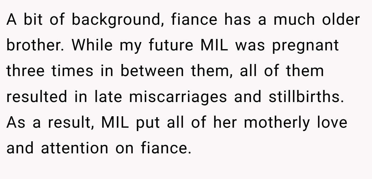 A bit of background, fiance has a much older brother. While my future MIL was pregnant three times in between them, all of them resulted in late miscarriages and stillbirths. As a result, MIL put all of her motherly love and attention on fiance.