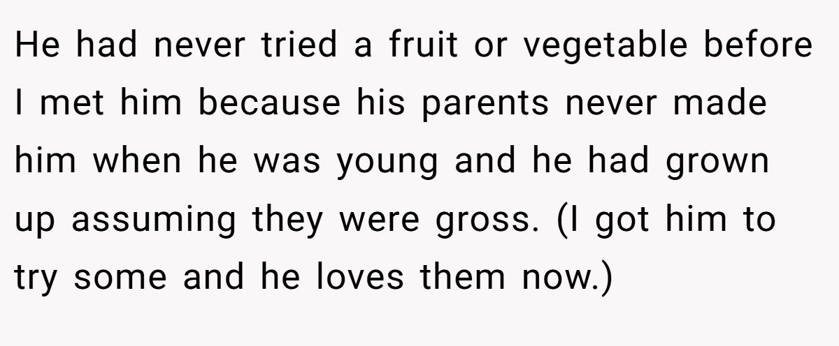 He had never tried a fruit or vegetable before I met him because his parents never made him when he was young and he had grown up assuming they were gross. (I got him to try some and he loves them now.)