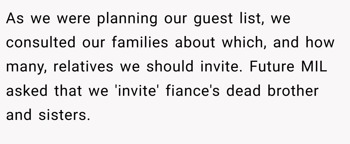 As we were planning our guest list, we consulted our families about which, and how many, relatives we should invite. Future MIL asked that we 'invite' fiance's dead brother and sisters.