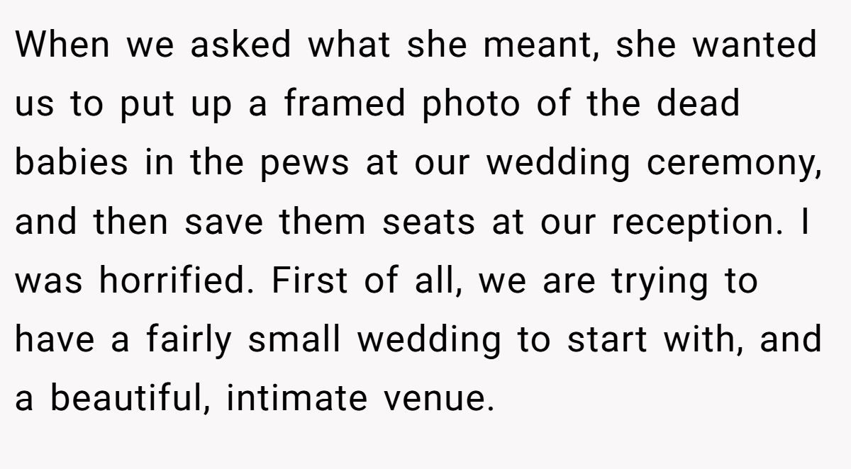 Focusing on a small, romantic ceremony of 30–50 loved ones, she was taken aback when her future mother-in-law asked to display framed photos of her miscarried children in pews—and save seats at the reception. Husband-to-be agreed it felt eerie, but pushed a “compromise.” Drama erupted. Want the full scoop? Dive into the original story below!