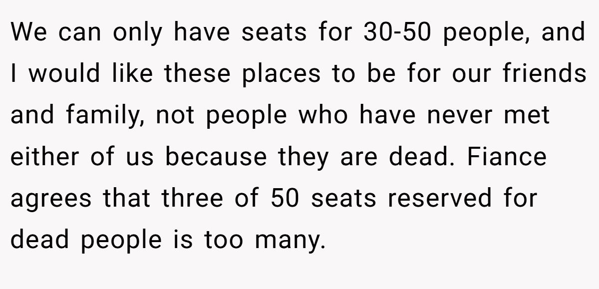 We can only have seats for 30-50 people, and I would like these places to be for our friends and family, not people who have never met either of us because they are dead. Fiance agrees that three of 50 seats reserved for dead people is too many.