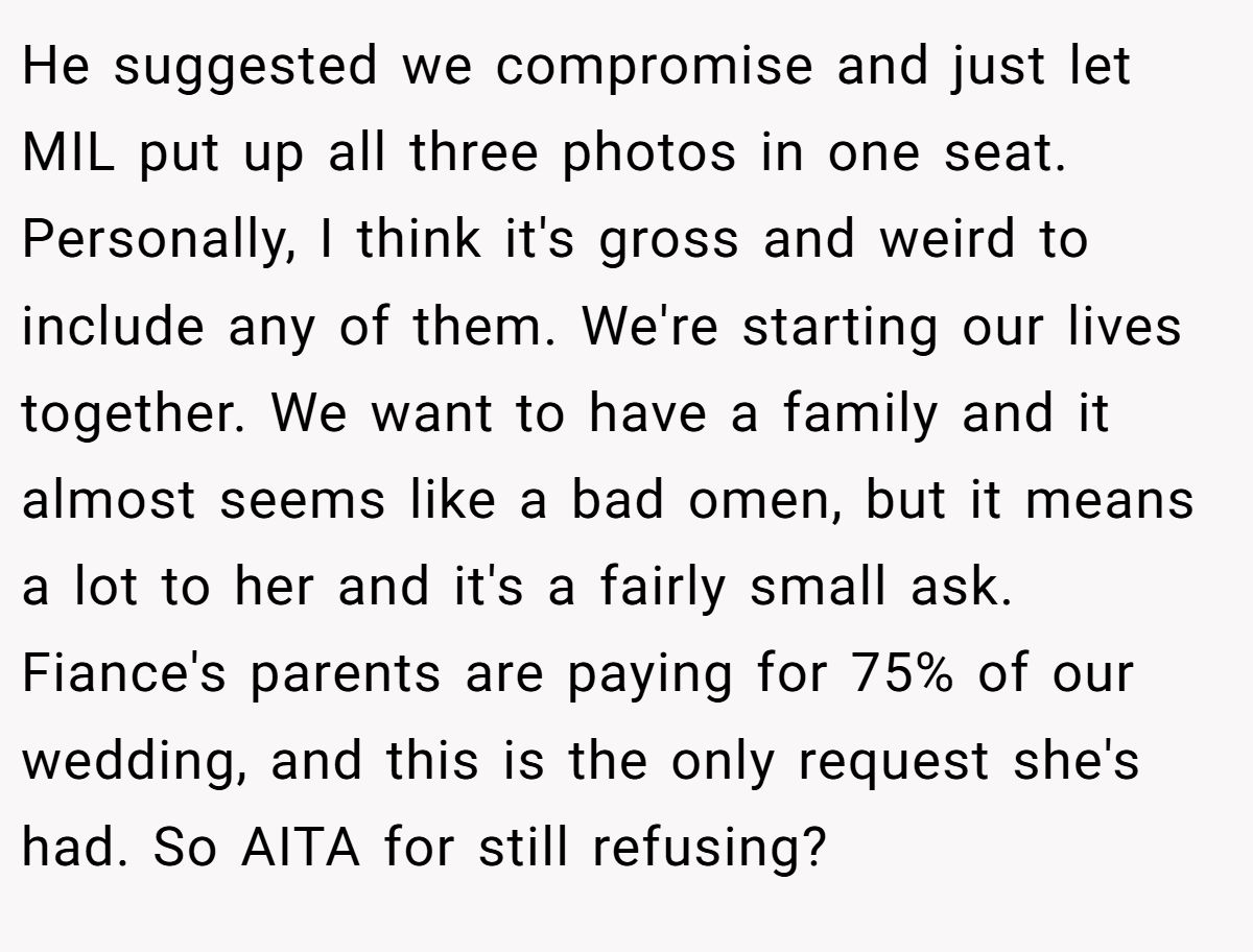 He suggested we compromise and just let MIL put up all three photos in one seat. Personally, I think it's gross and weird to include any of them. We're starting our lives together. We want to have a family and it almost seems like a bad omen, but it means a lot to her and it's a fairly small ask. Fiance's parents are paying for 75% of our wedding, and this is the only request she's had. So AITA for still refusing?