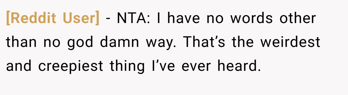[Reddit User] − NTA: I have no words other than no god damn way. That’s the weirdest and creepiest thing I’ve ever heard.