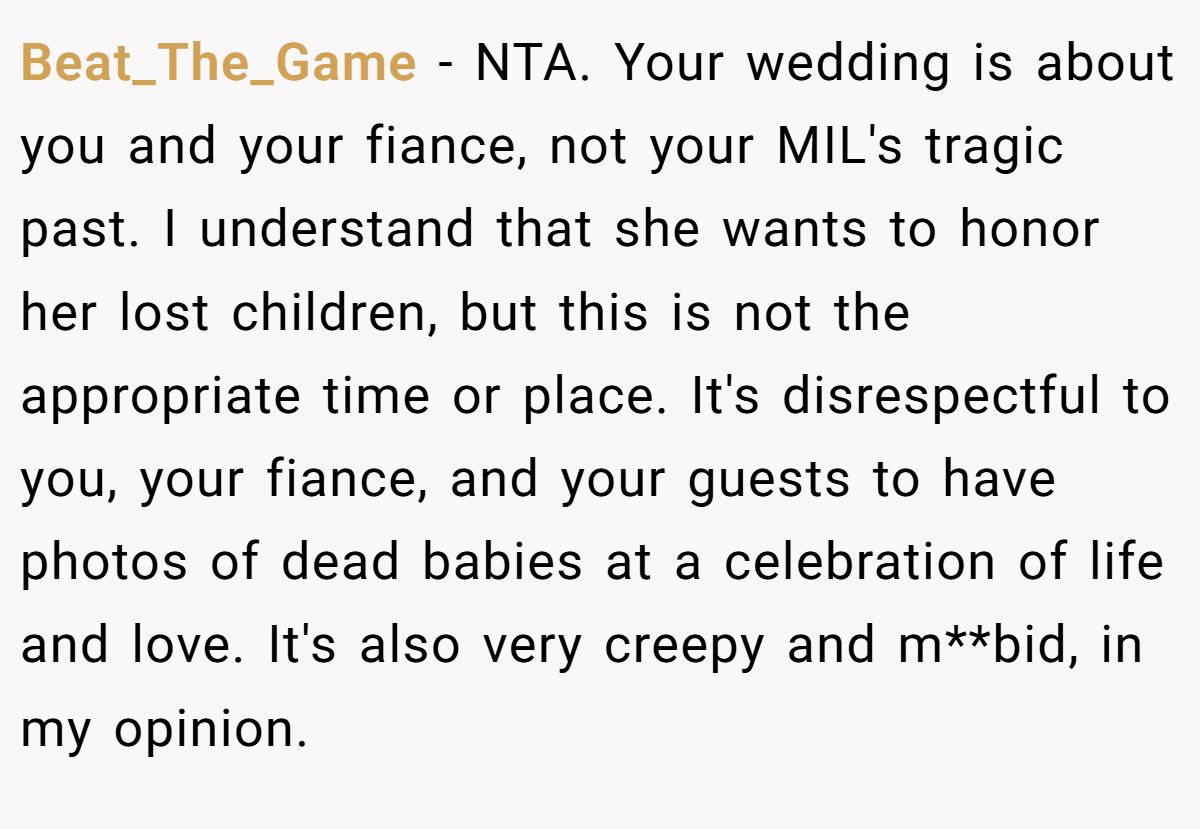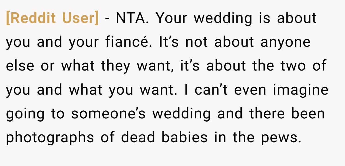[Reddit User] − NTA. Your wedding is about you and your fiancé. It’s not about anyone else or what they want, it’s about the two of you and what you want. I can’t even imagine going to someone’s wedding and there been photographs of dead babies in the pews.