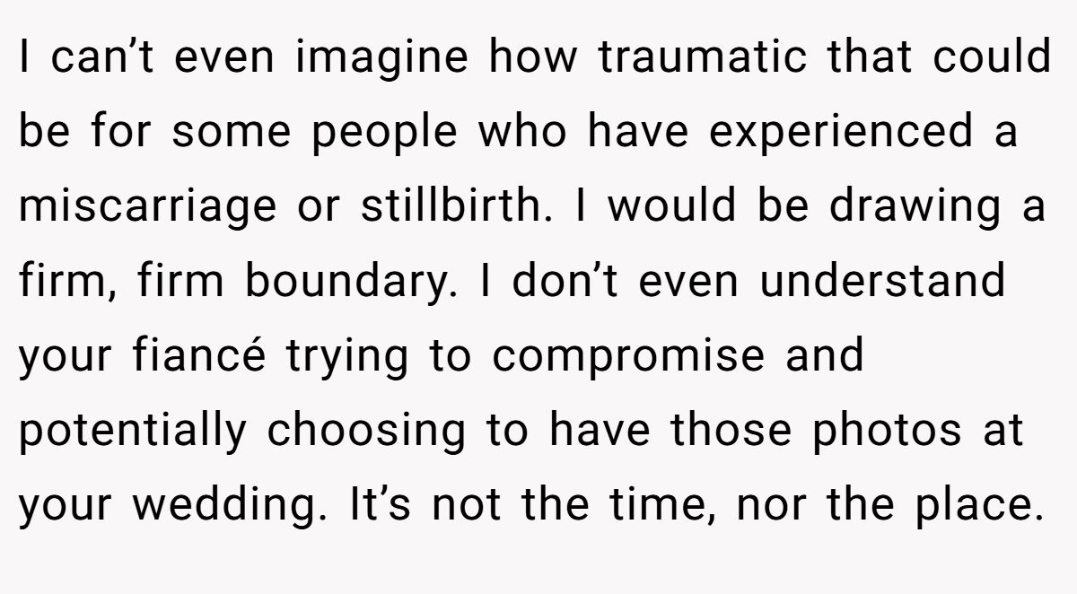 I can’t even imagine how traumatic that could be for some people who have experienced a miscarriage or stillbirth. I would be drawing a firm, firm boundary. I don’t even understand your fiancé trying to compromise and potentially choosing to have those photos at your wedding. It’s not the time, nor the place.