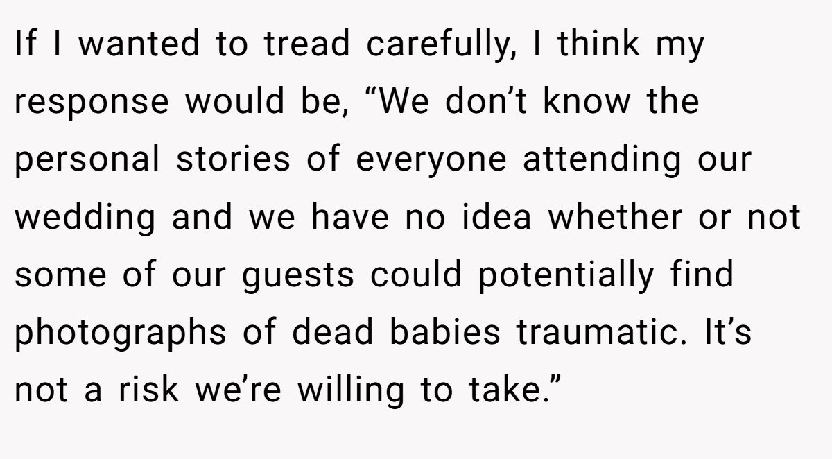 If I wanted to tread carefully, I think my response would be, “We don’t know the personal stories of everyone attending our wedding and we have no idea whether or not some of our guests could potentially find photographs of dead babies traumatic. It’s not a risk we’re willing to take.”