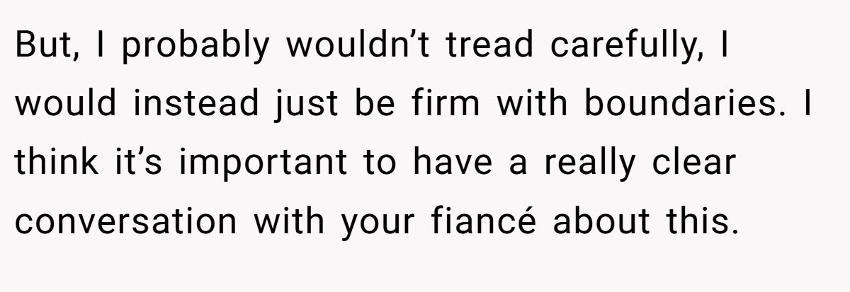 But, I probably wouldn’t tread carefully, I would instead just be firm with boundaries. I think it’s important to have a really clear conversation with your fiancé about this.