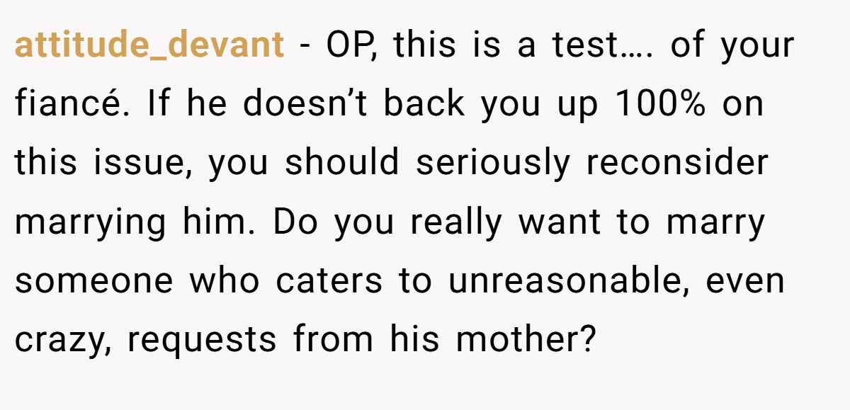 attitude_devant − OP, this is a test…. of your fiancé. If he doesn’t back you up 100% on this issue, you should seriously reconsider marrying him. Do you really want to marry someone who caters to unreasonable, even crazy, requests from his mother?