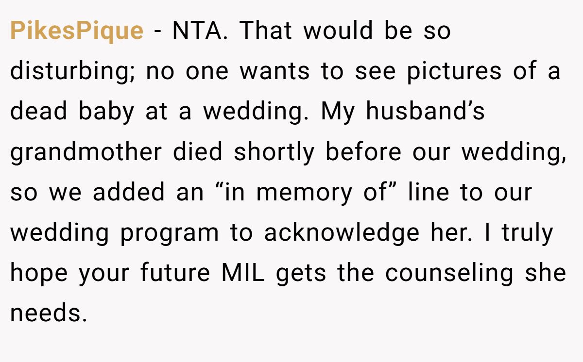 PikesPique − NTA. That would be so disturbing; no one wants to see pictures of a dead baby at a wedding. My husband’s grandmother died shortly before our wedding, so we added an “in memory of” line to our wedding program to acknowledge her. I truly hope your future MIL gets the counseling she needs.