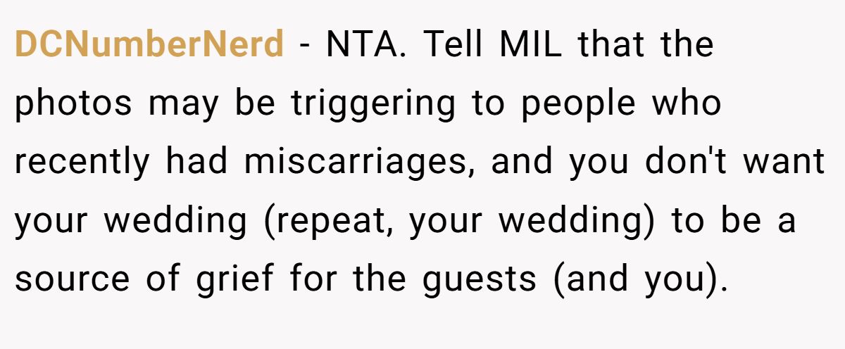 DCNumberNerd − NTA. Tell MIL that the photos may be triggering to people who recently had miscarriages, and you don't want your wedding (repeat, your wedding) to be a source of grief for the guests (and you).