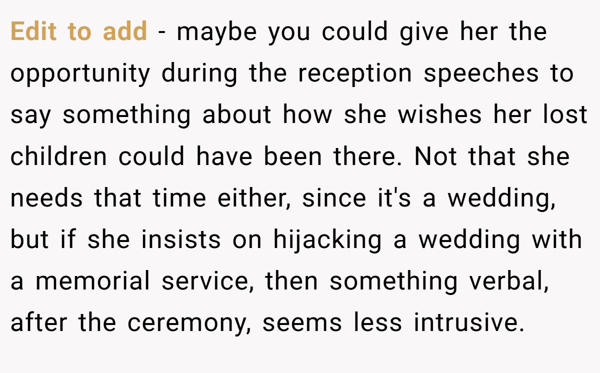 Do you think she was too harsh? Is there a gentler way to respect lost children at a wedding? Share your thoughts below!