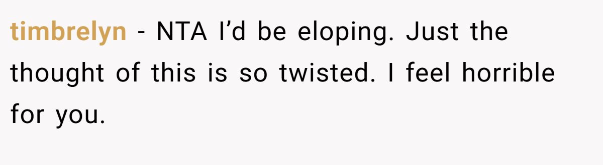 timbrelyn − NTA I’d be eloping. Just the thought of this is so twisted. I feel horrible for you.