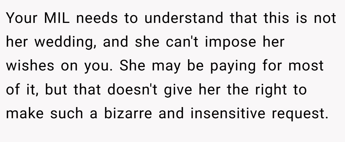 Beat_The_Game emphasized the wedding’s joyful focus, calling MIL’s ask disrespectful.