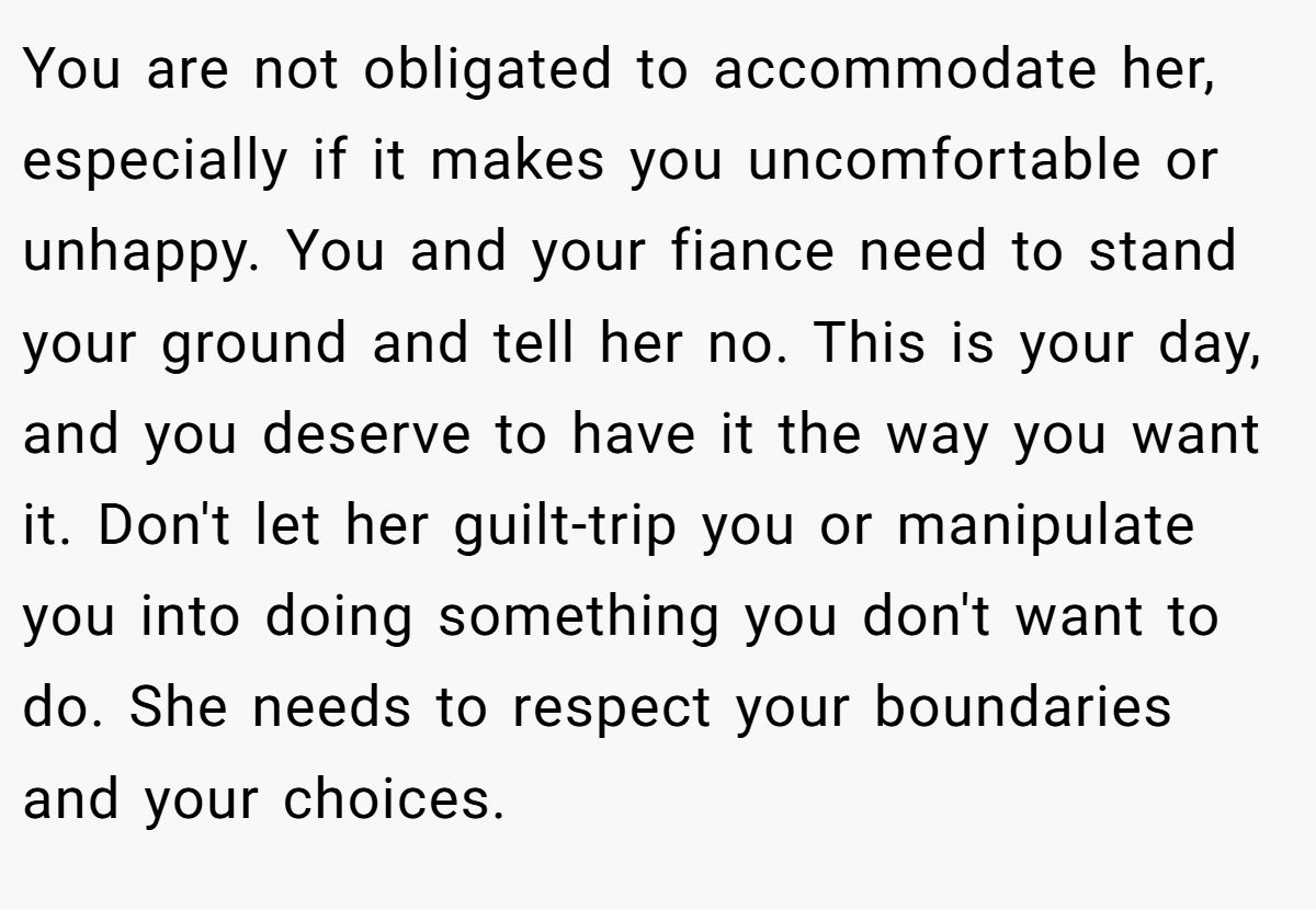 You are not obligated to accommodate her, especially if it makes you uncomfortable or unhappy. You and your fiance need to stand your ground and tell her no. This is your day, and you deserve to have it the way you want it. Don't let her guilt-trip you or manipulate you into doing something you don't want to do. She needs to respect your boundaries and your choices.