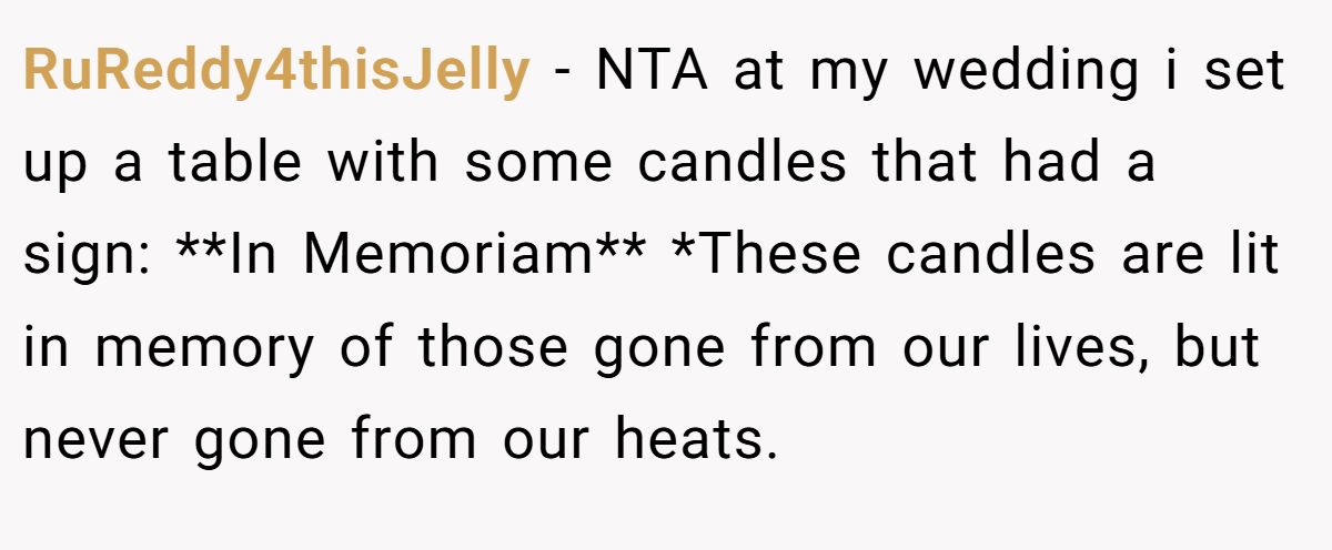 When wedding plans collide with grief, it’s not always a fairy tale—but resolution is possible. In this case, the bride refused to allow that seat reservation and photo display, standing firm on what felt right for their celebration. That doesn’t erase the MIL’s grief, but it keeps the wedding focused on the couple.