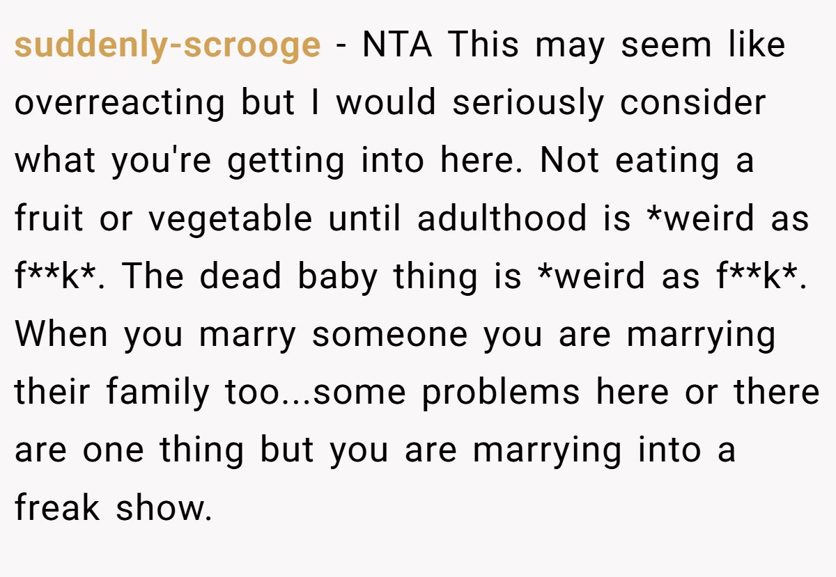 suddenly-scrooge − NTA This may seem like overreacting but I would seriously consider what you're getting into here. Not eating a fruit or vegetable until adulthood is *weird as f**k*. The dead baby thing is *weird as f**k*. When you marry someone you are marrying their family too...some problems here or there are one thing but you are marrying into a freak show.