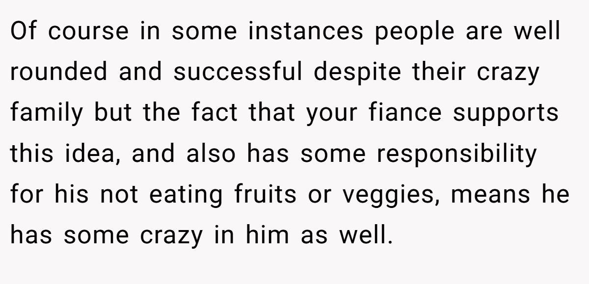 Of course in some instances people are well rounded and successful despite their crazy family but the fact that your fiance supports this idea, and also has some responsibility for his not eating fruits or veggies, means he has some crazy in him as well.