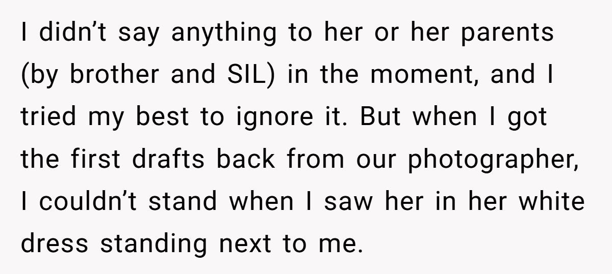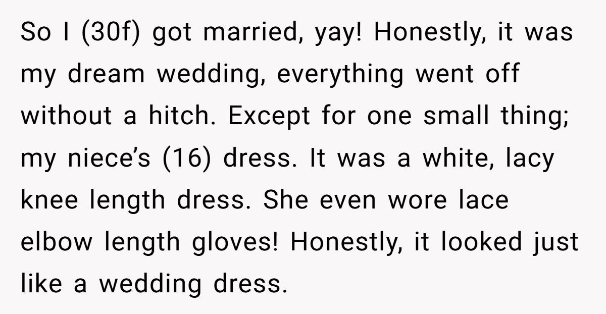 After months of planning her dream wedding, everything went beautifully—except one detail. Her teenage niece showed up in a lacy white dress (with gloves!) that looked suspiciously bridal. The bride kept her cool… until the photos came in. What happened next had her in-laws crying foul, even though no one had broken a sweat on the big day. Want to know how one digital edit turned into a real-world family feud? Dive into the full story below.