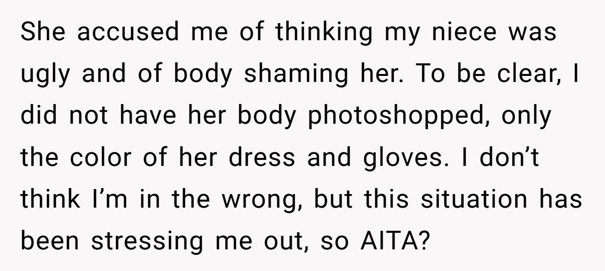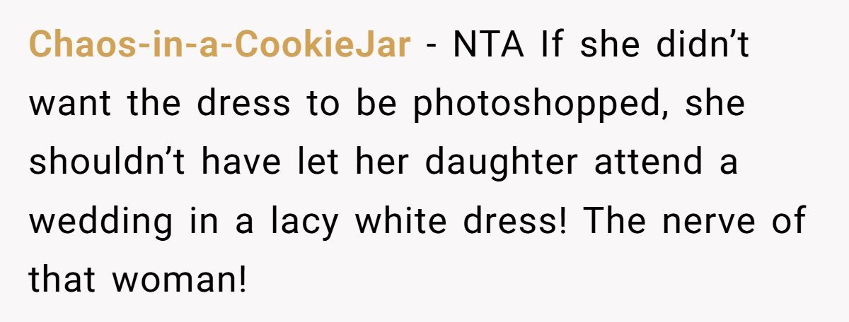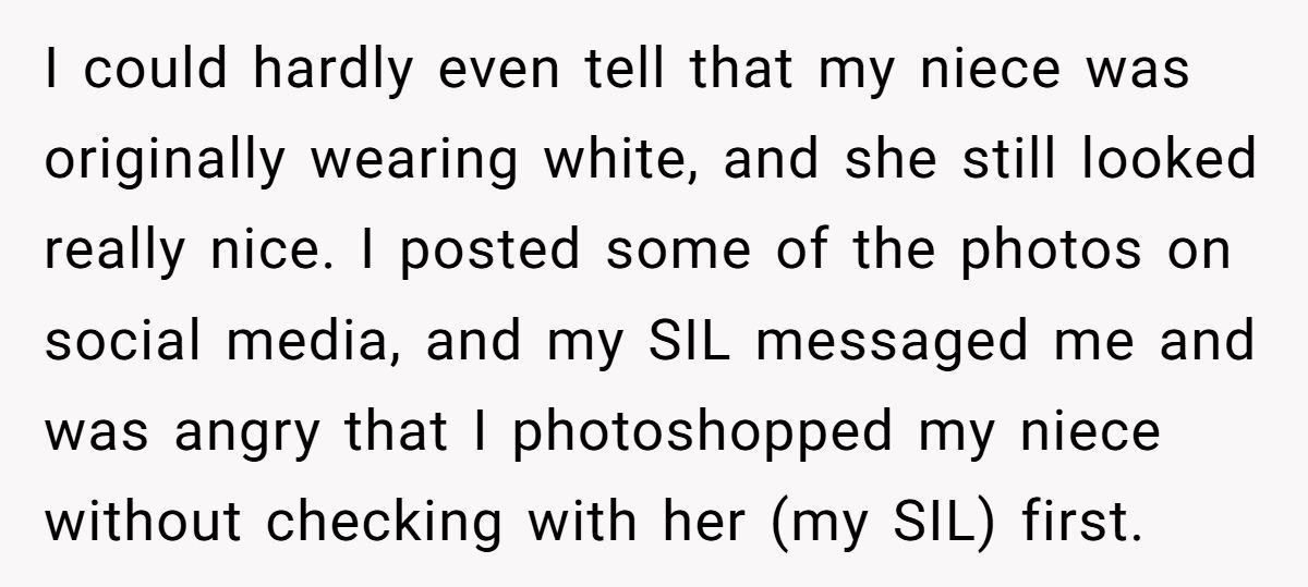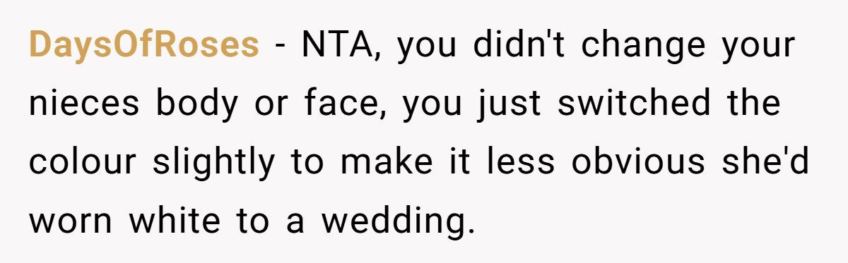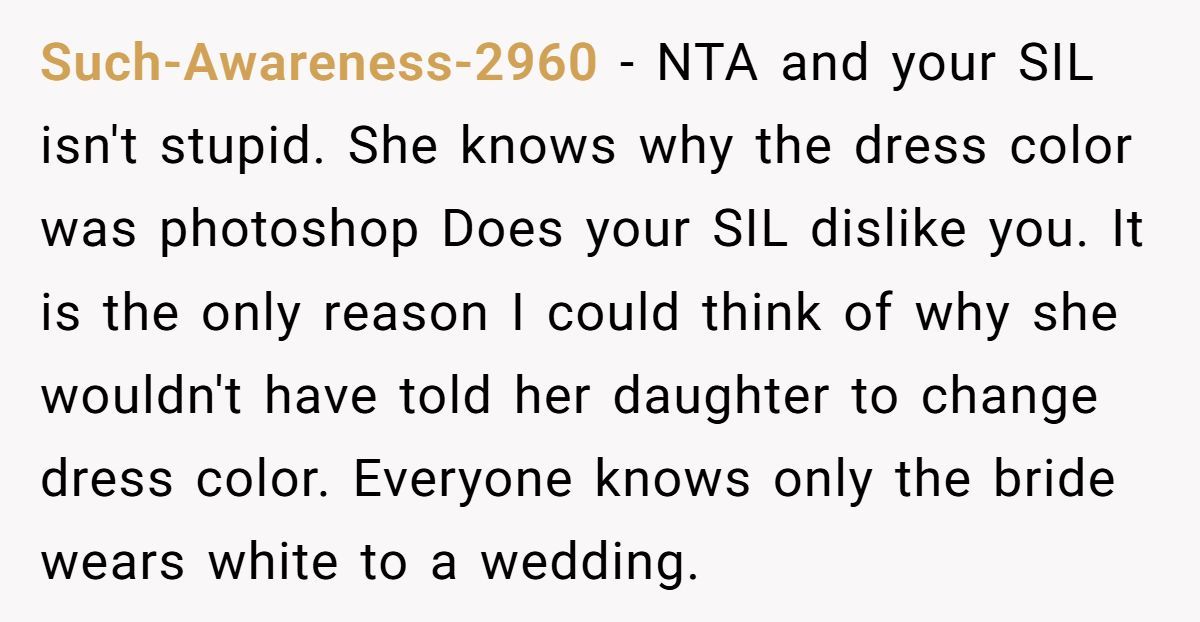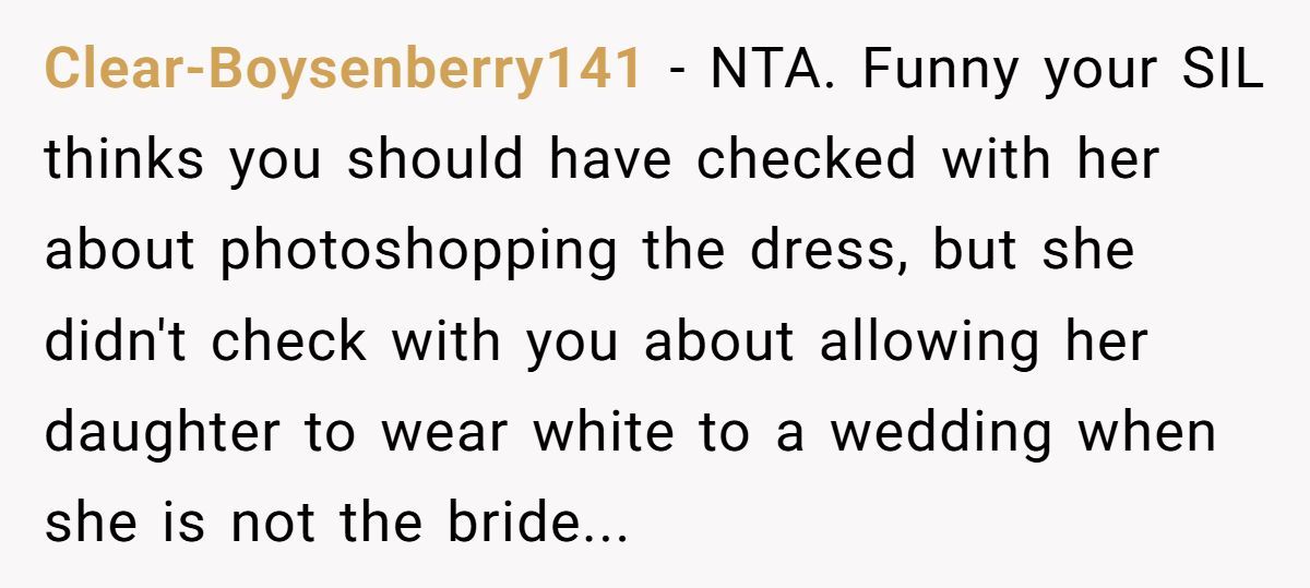 These Redditors supported the bride’s edit, arguing the SIL’s body-shaming claim was baseless since only the dress color was changed