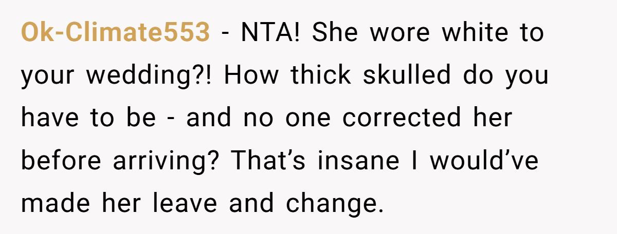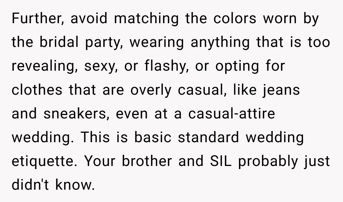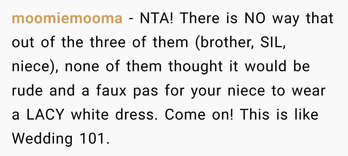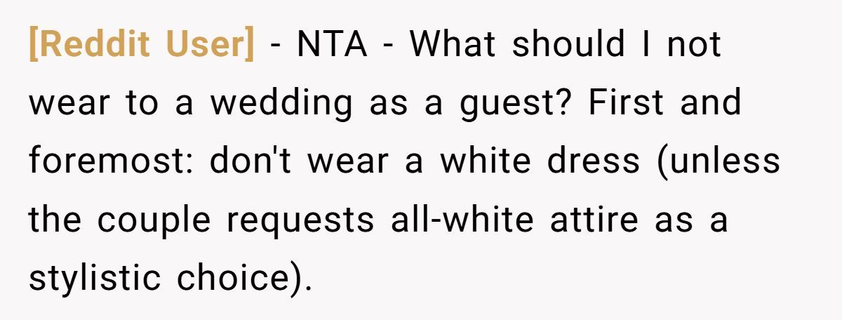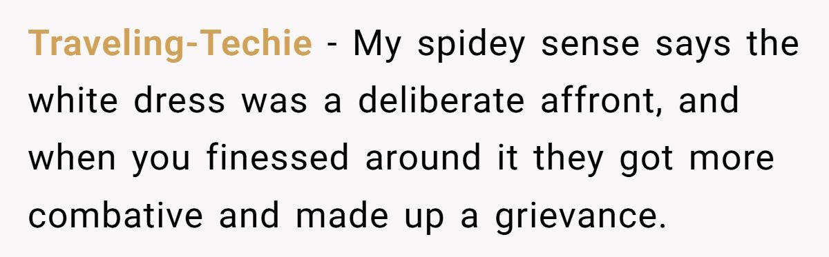 From the sister-in-law’s reaction, the dress wasn’t the only thing that stood out. The accusation of body-shaming suggests a deeper insecurity or defensiveness—possibly from embarrassment over having allowed the dress in the first place. After all, if someone chooses to flout a well-known tradition, they can’t act shocked when someone else politely fixes it.