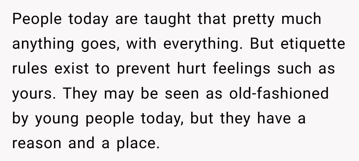 This story raises bigger questions about family dynamics. Are we too quick to defend poor etiquette under the guise of inclusion or modernity? And when someone corrects it gently, why do we assume the worst intentions?