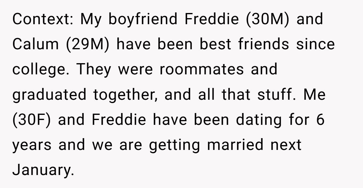 In this case, the bride’s main concern was that her fiancé, Freddie, would feel obligated to monitor his friend Calum during episodes of catatonia at their wedding. Instead of having an open conversation with both men, she spoke to Calum privately, convinced him to bow out, then told Freddie he had declined on his own.