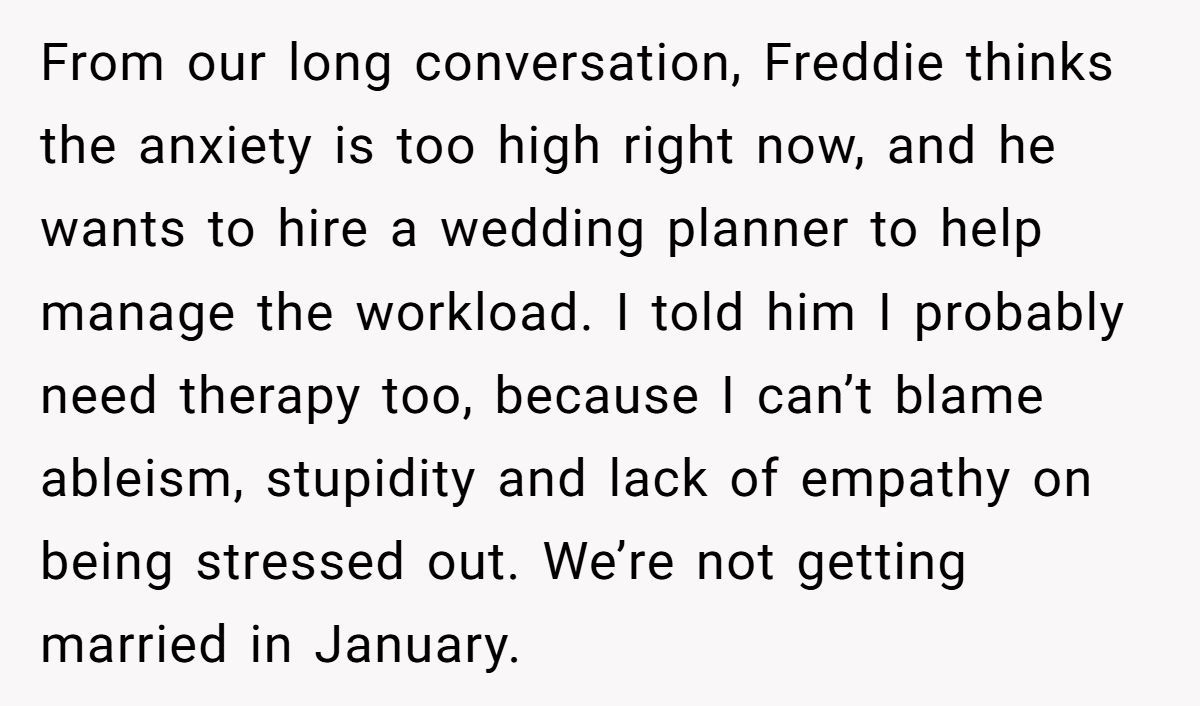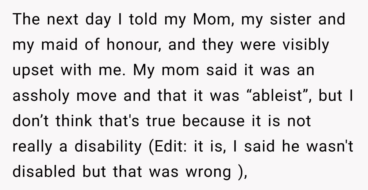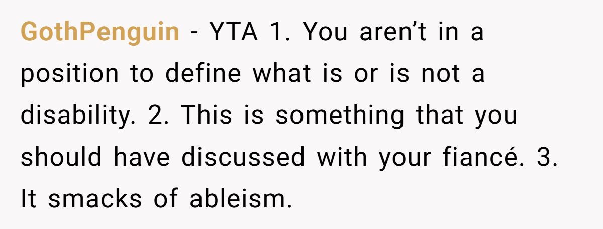 Psychologist Dr. Devon Price notes that “ableism is most dangerous when it’s quiet, subtle, and wrapped in polite intentions.” The bride didn’t shout, mock, or belittle—but she minimized a diagnosis, disregarded her fiancé’s closest relationship, and made the entire situation about aesthetics rather than empathy.