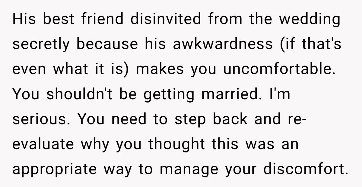 One bride-to-be thought she was doing everyone a favor when she discreetly uninvited her fiancé’s best friend from their wedding. The reason? His medical condition, catatonia, might lead to him zoning out during the ceremony—and she didn’t want her soon-to-be husband “babysitting” on their big day.