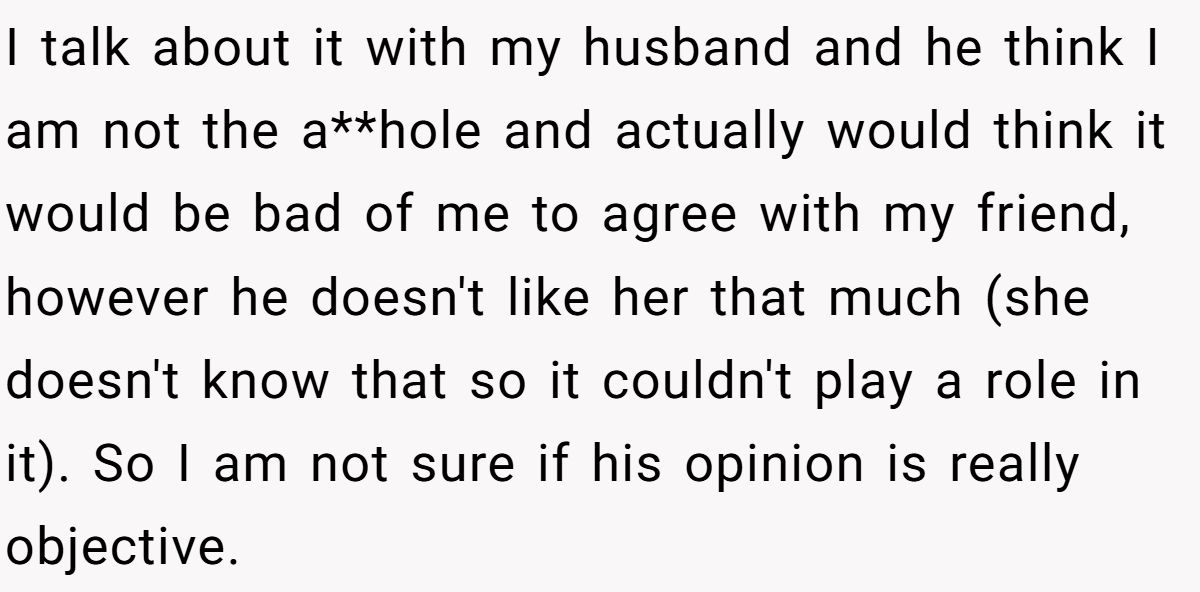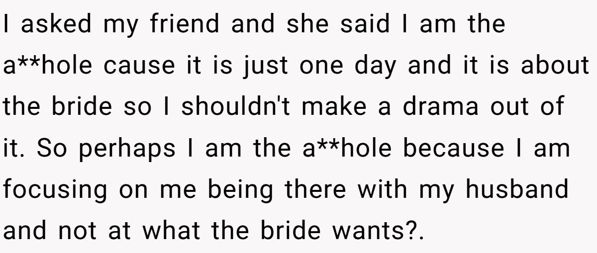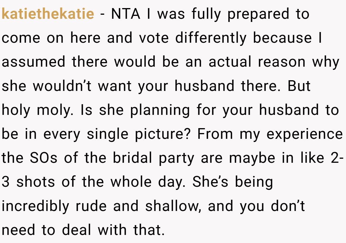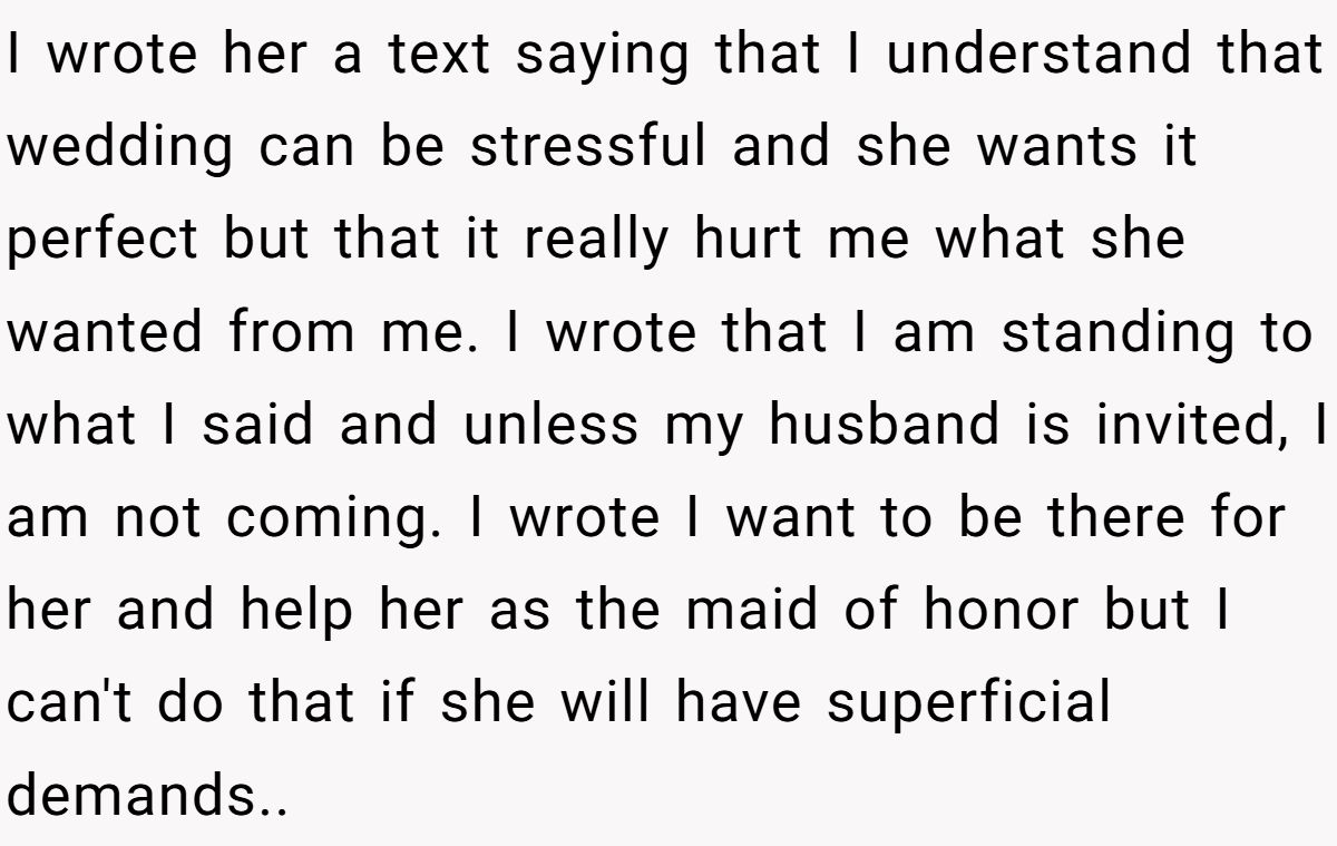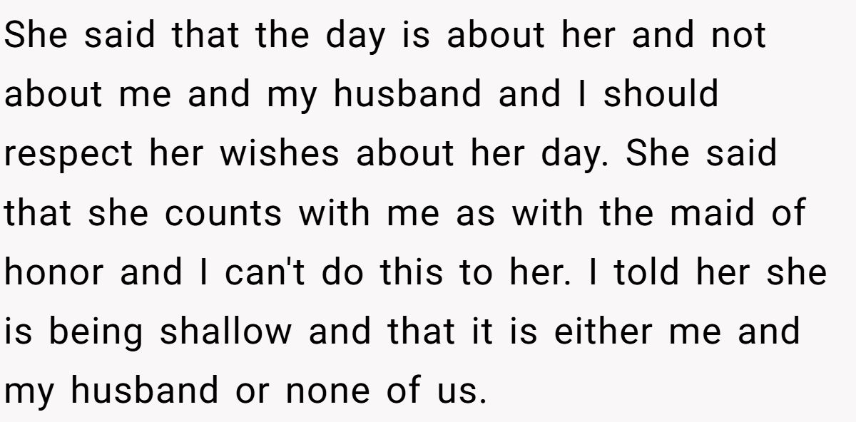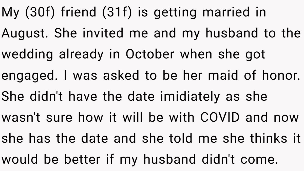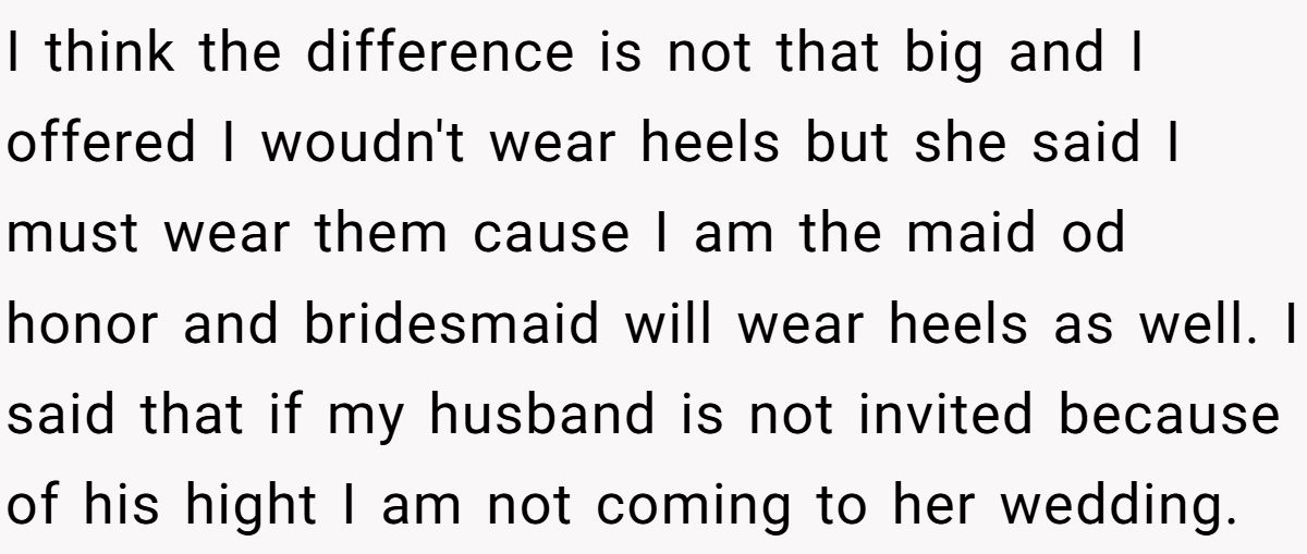 In this case, the bride told her friend, who was supposed to be the maid of honor, that her husband wasn’t welcome due to his “unflattering” height in photos. According to Dr. Katherine Hertlein, a licensed marriage and family therapist at the University of Nevada, “Setting boundaries in relationships is essential, but when they cross into control or shame, that’s when you risk damaging the relationship.”