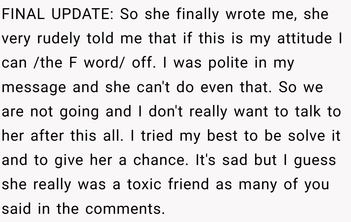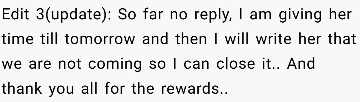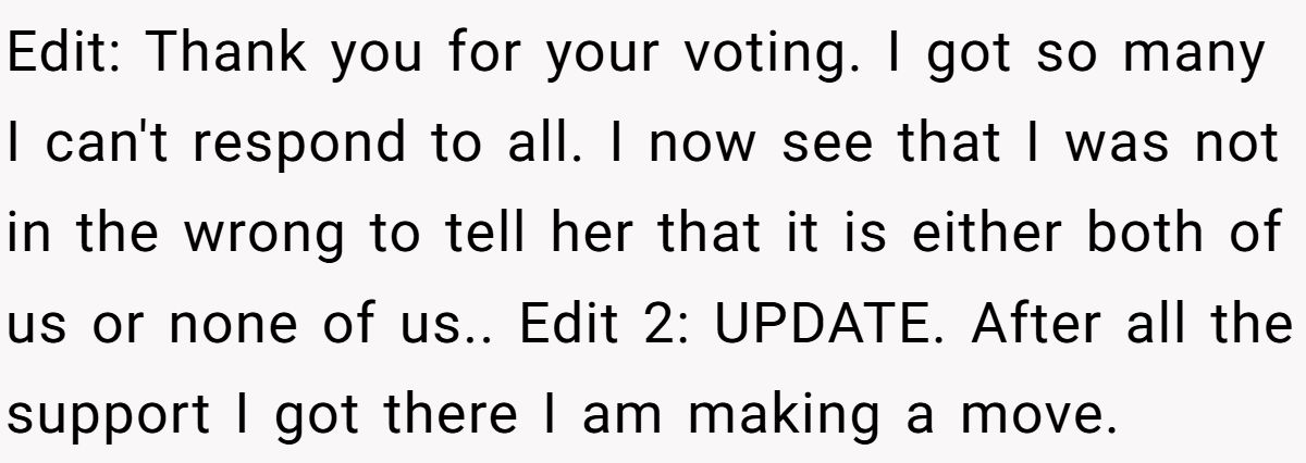 The woman’s response was simple: “It’s either both of us or none of us.” Her stance speaks volumes about loyalty and self-respect. In healthy relationships, compromise doesn’t mean sacrificing your dignity—or your partner.