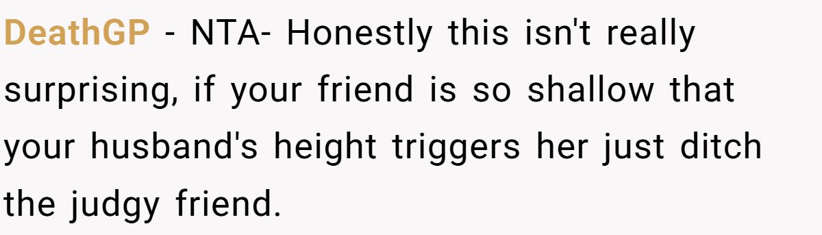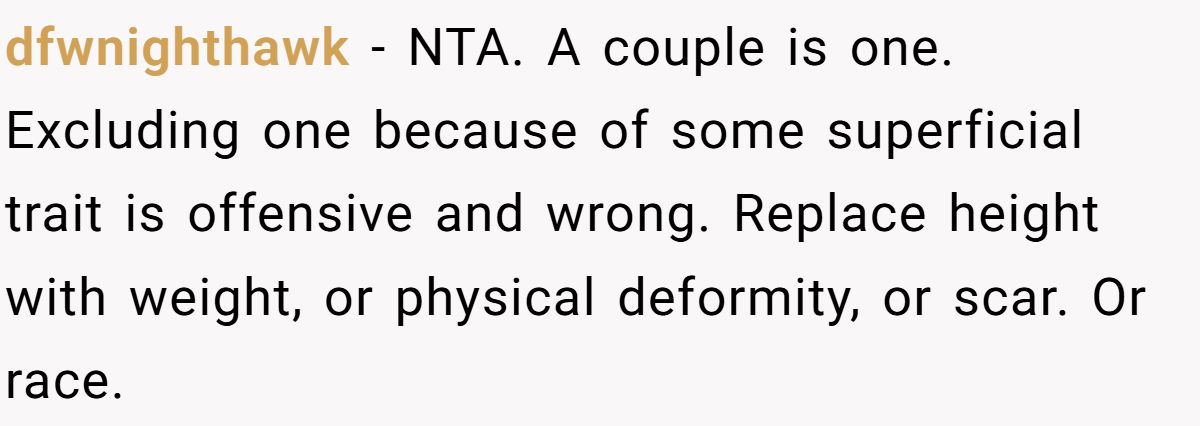 A wedding should be filled with love, laughter, and questionable dance moves—not height discrimination. But one Redditor found herself facing an oddly specific (and wildly shallow) dilemma after her longtime friend uninvited her husband… because he’s an inch shorter than her.