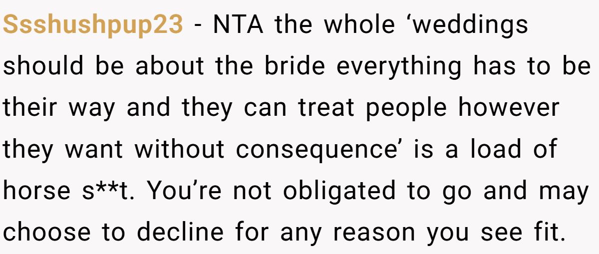 Redditors did not hold back—many rallied behind the woman’s decision and called out the bride’s pettiness