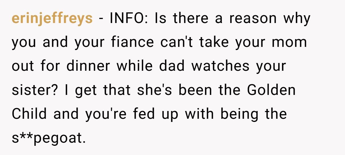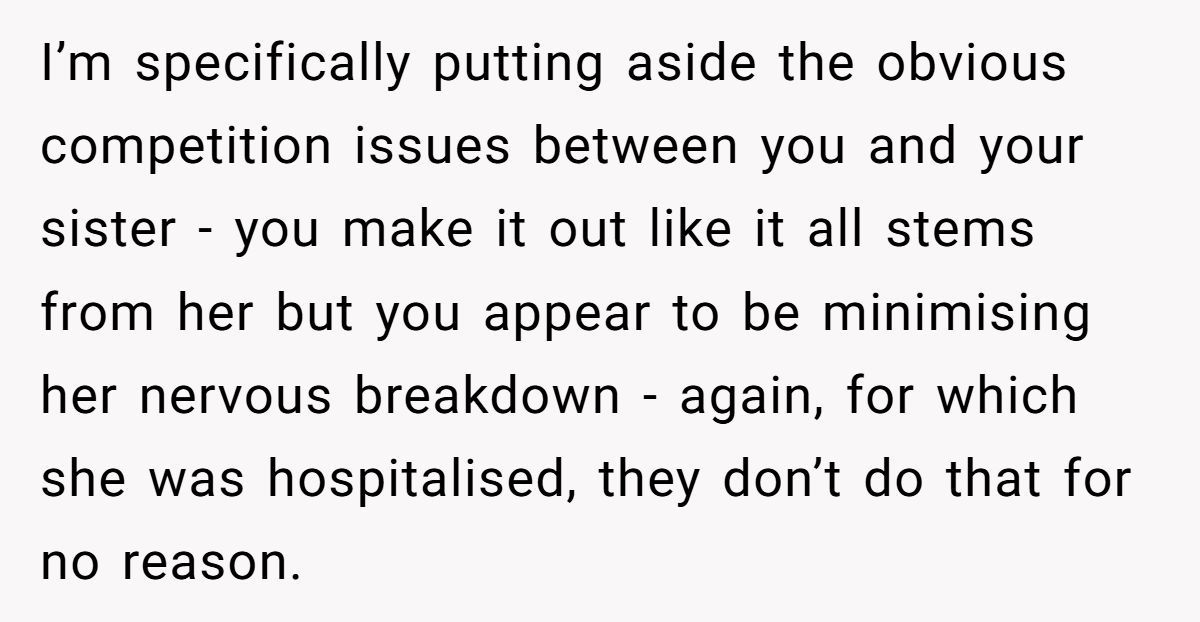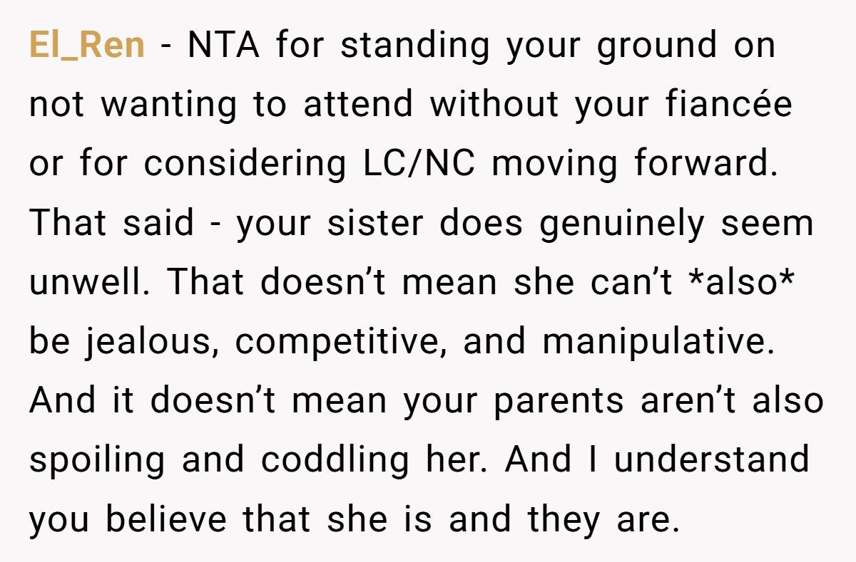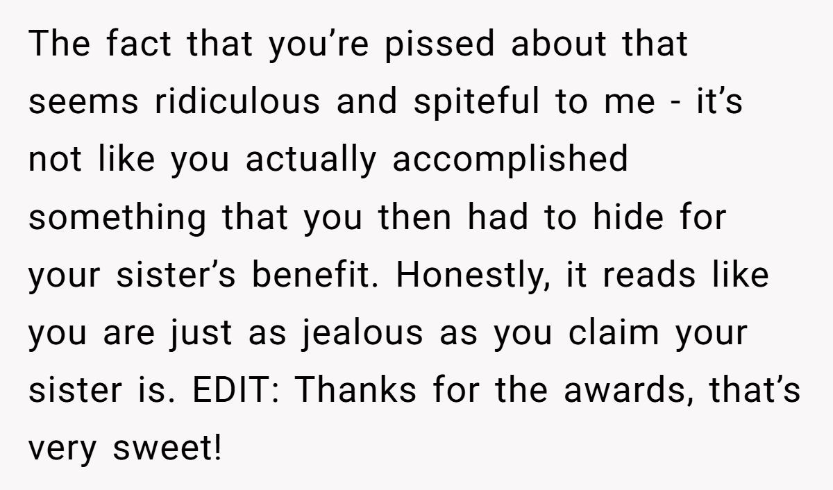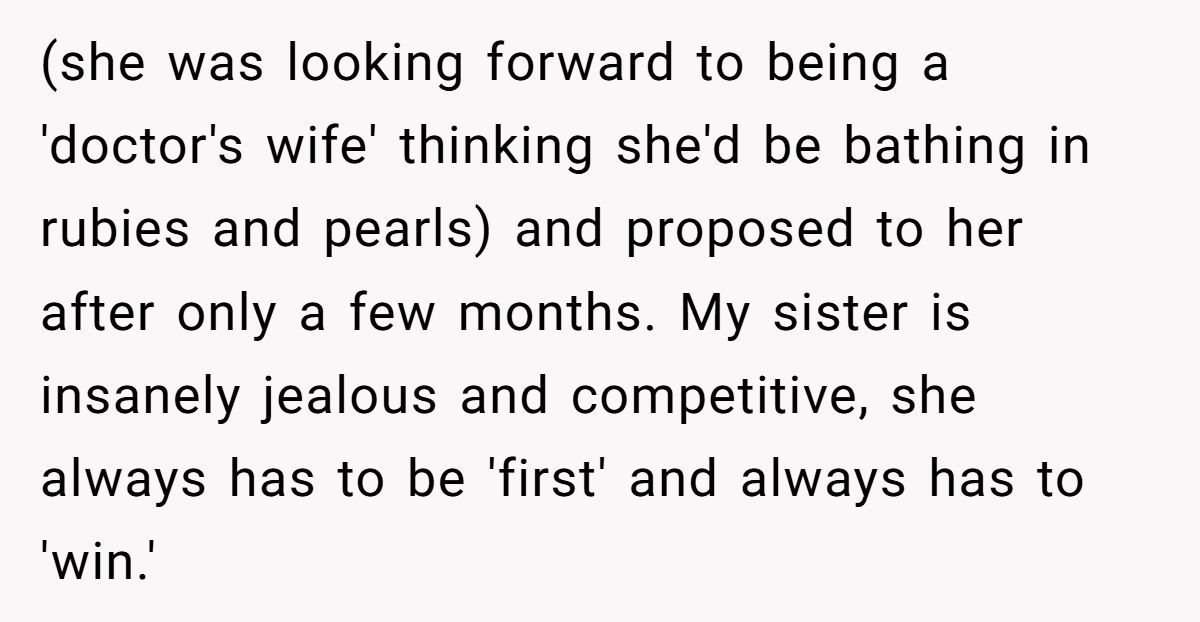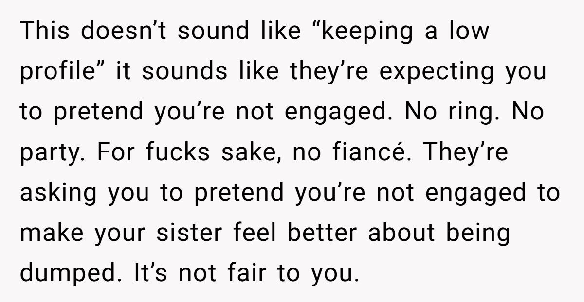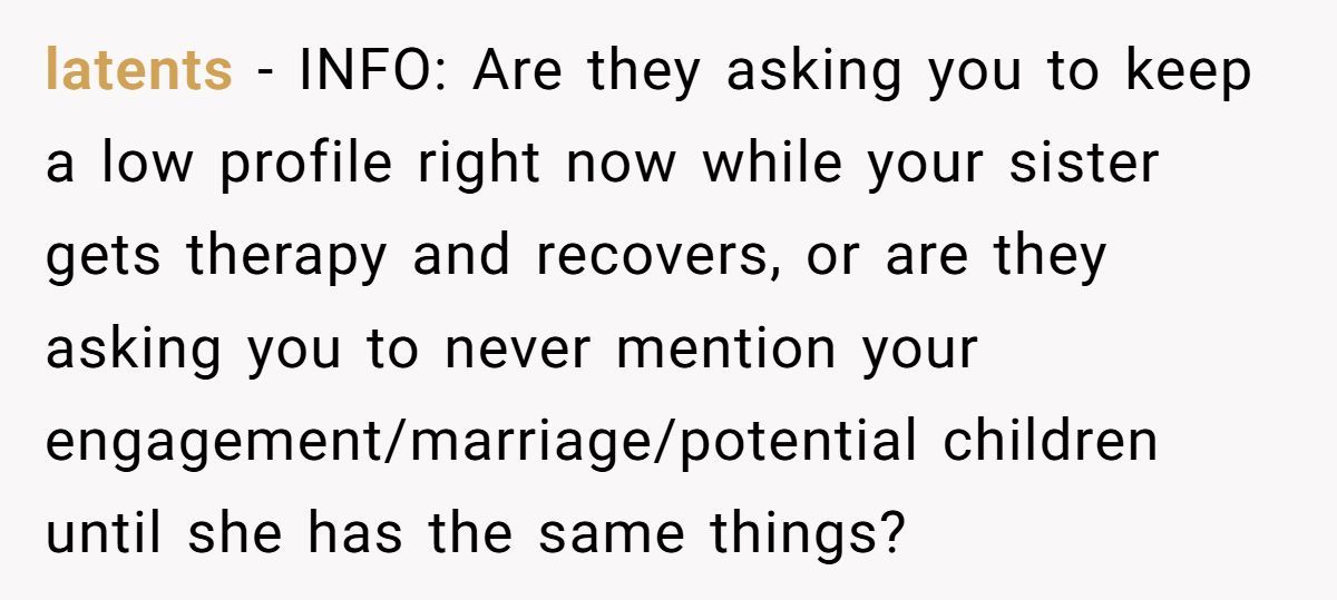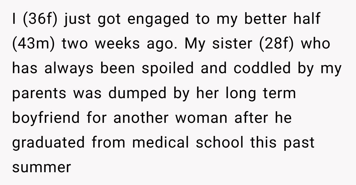 That’s the heart of this post from a 36-year-old woman whose joyful milestone collided head-on with her family’s history of favoritism. Her sister, recently dumped by a long-time partner after he became a doctor, had a breakdown so severe she was hospitalized. Now back home with their parents, she’s fragile—and apparently, easily triggered by her sibling’s happiness.