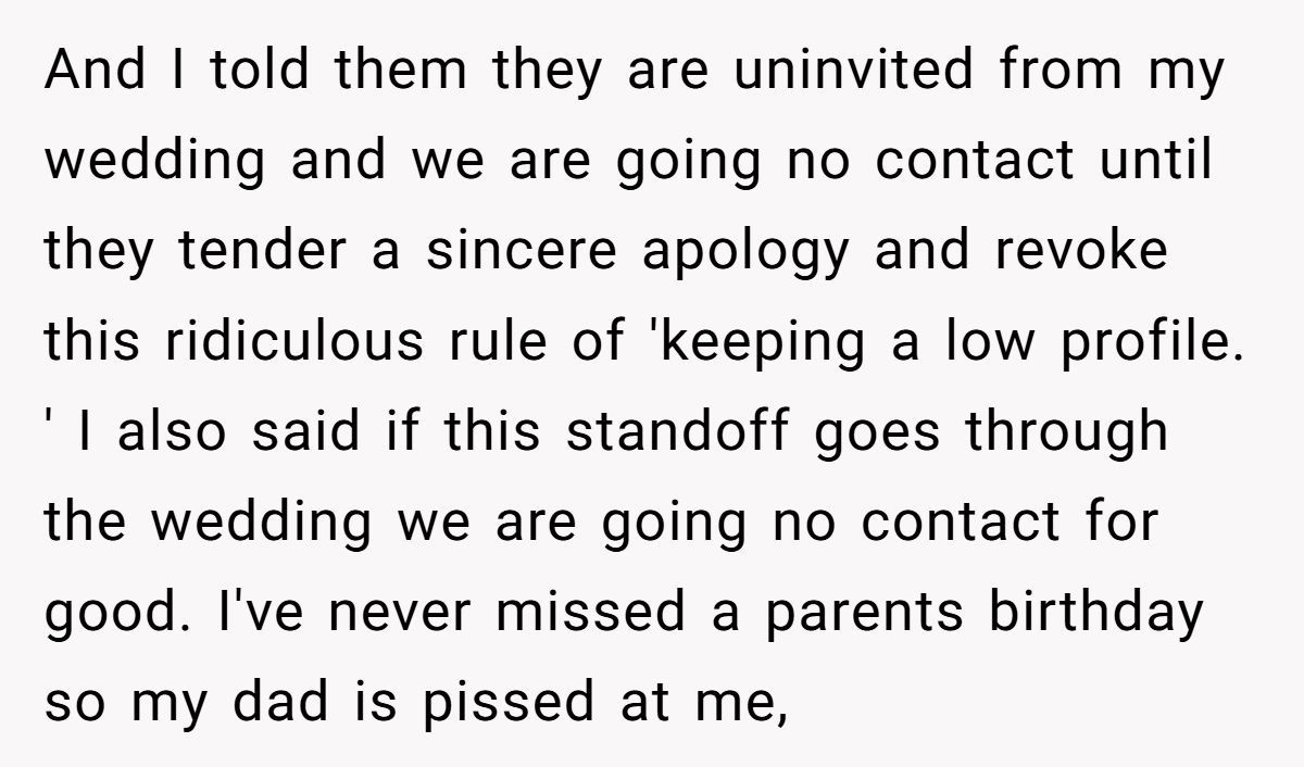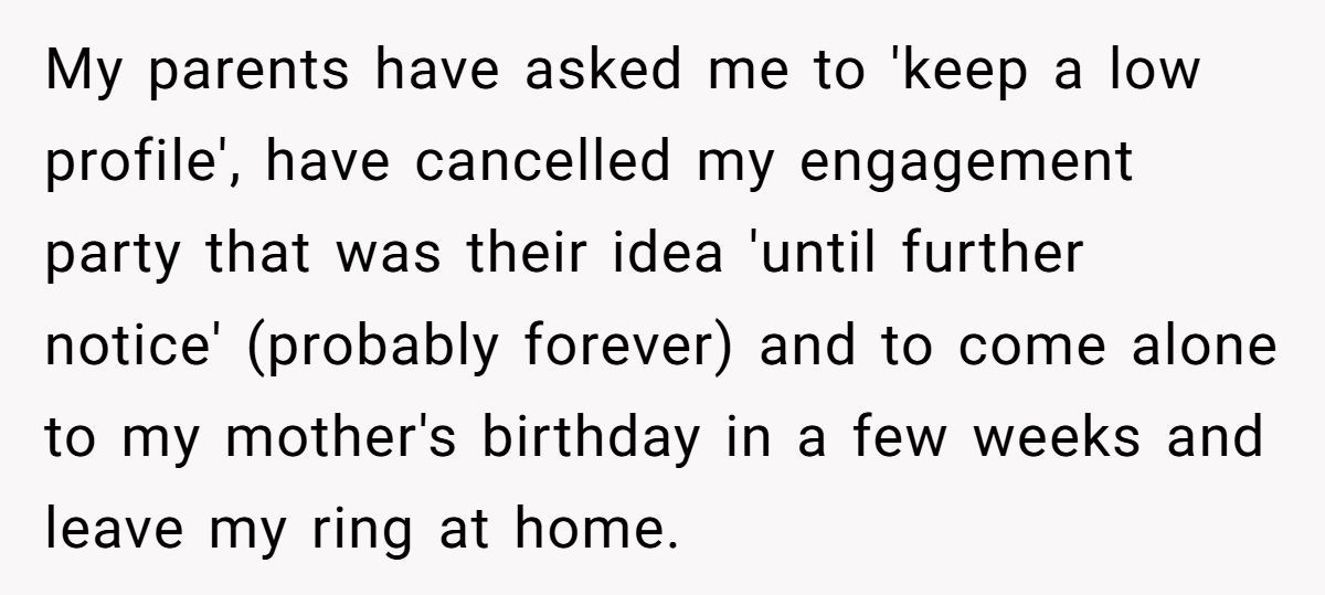 OP’s parents canceled her engagement party, told her to ditch her fiancé for family events, and even asked her to take off her ring. She refused. What followed was a standoff: no birthday appearance, no wedding invitation for her parents, and a threat to go no-contact unless they reversed course. So—was this heartless or necessary?