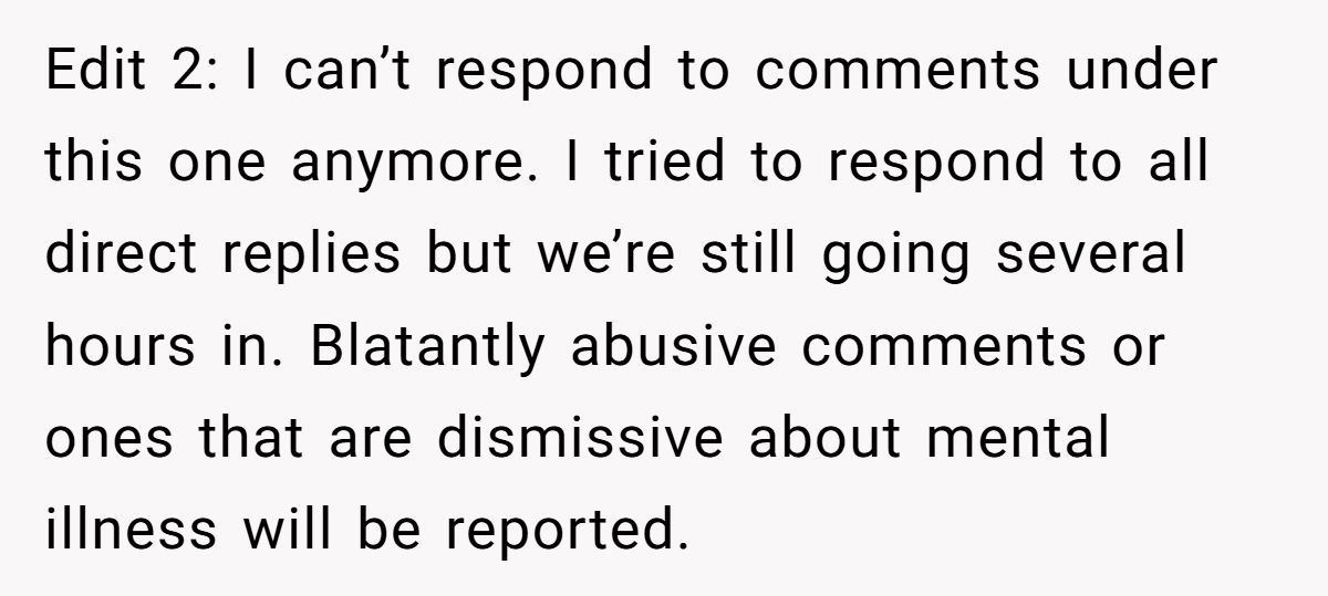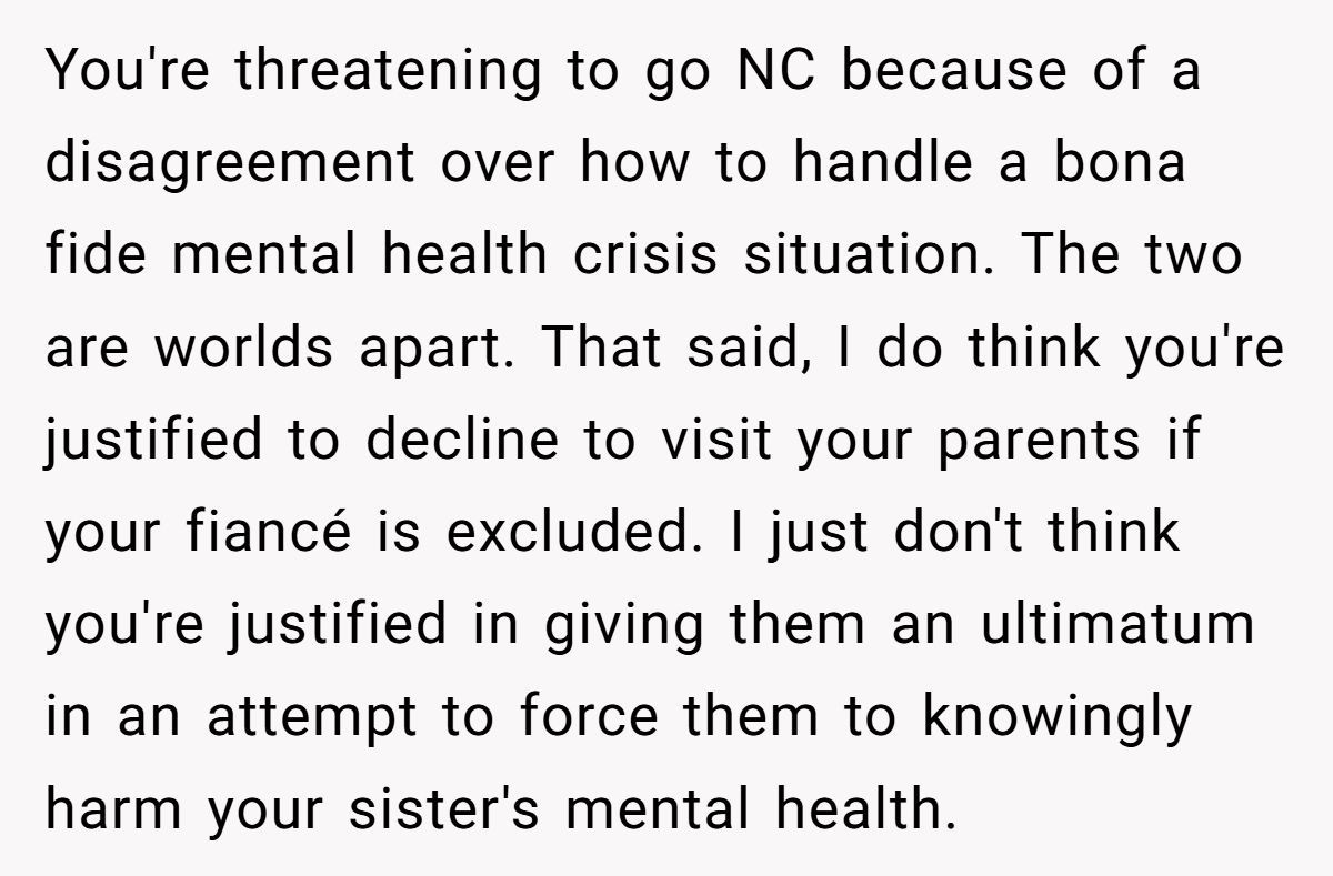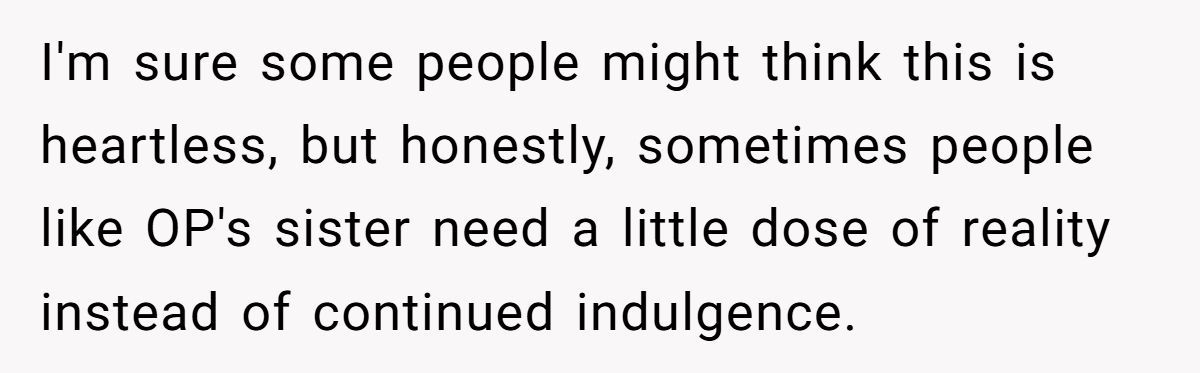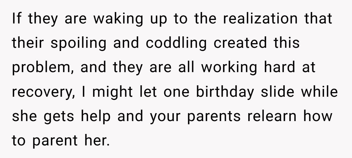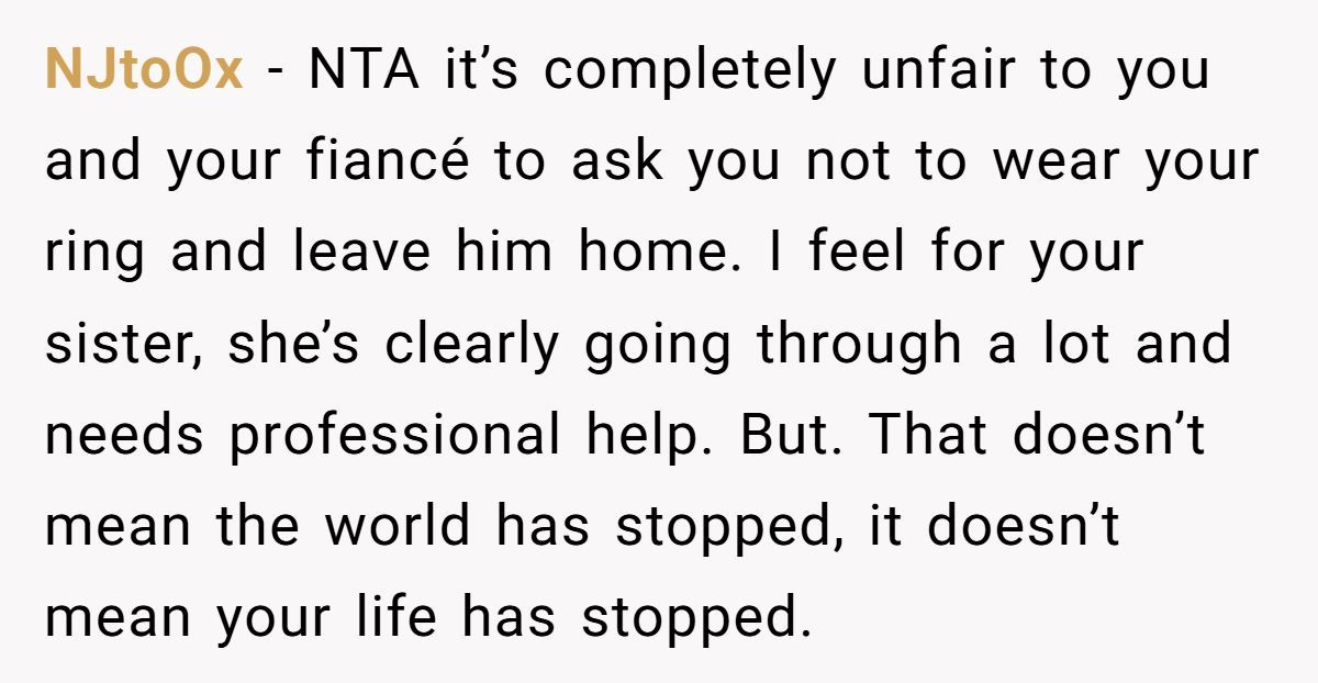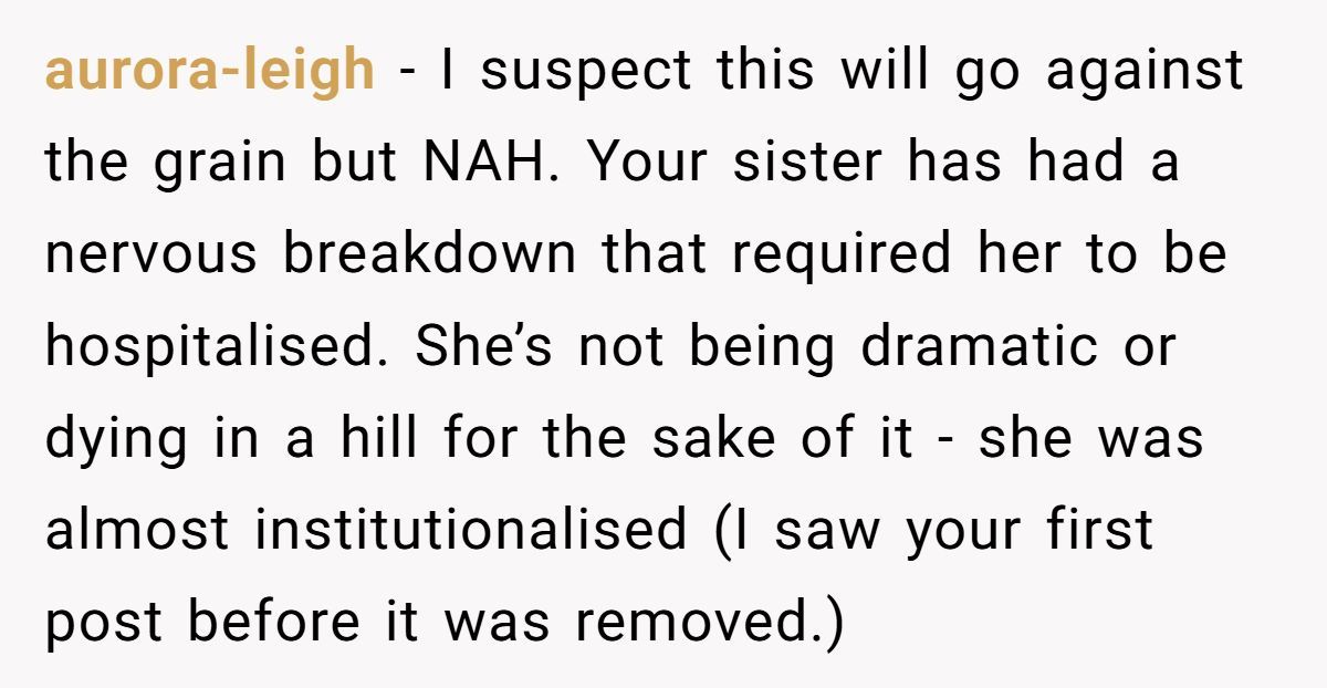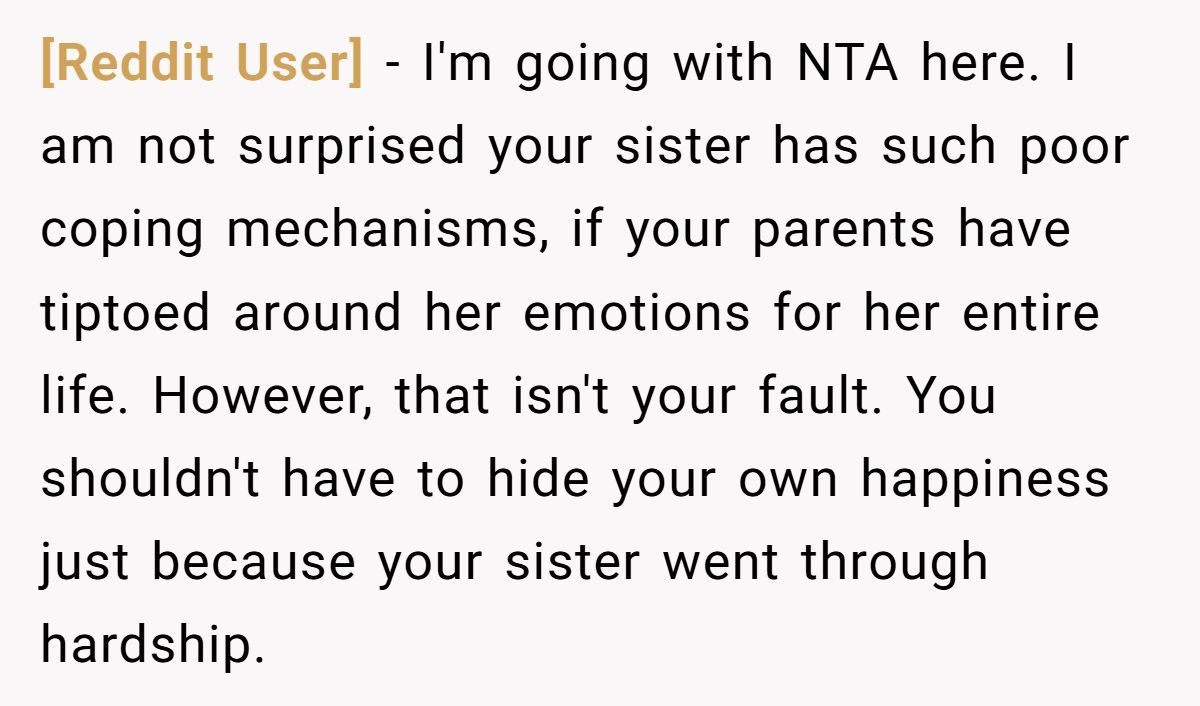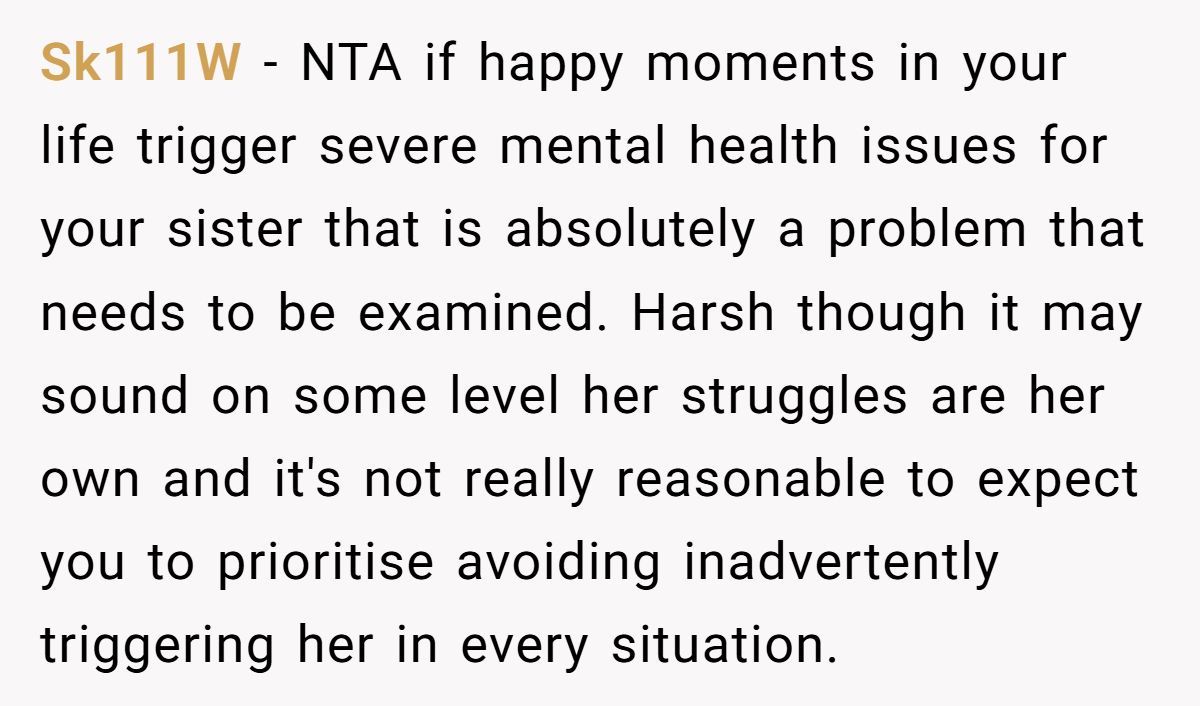 The broader issue here is balancing mental health crises with family fairness. The sister needs professional help, not just parental shielding, which may perpetuate her fragility. The Redditor could maintain her boundaries while offering empathy—perhaps a private chat to acknowledge her sister’s pain without dimming her own joy. A family therapist could help navigate this mess.