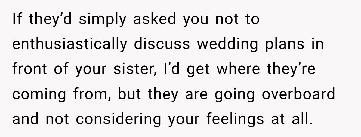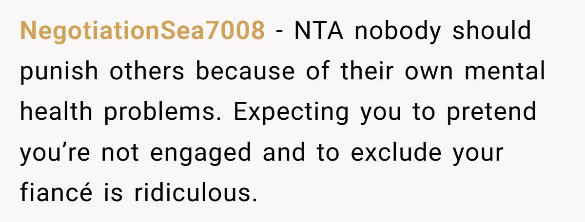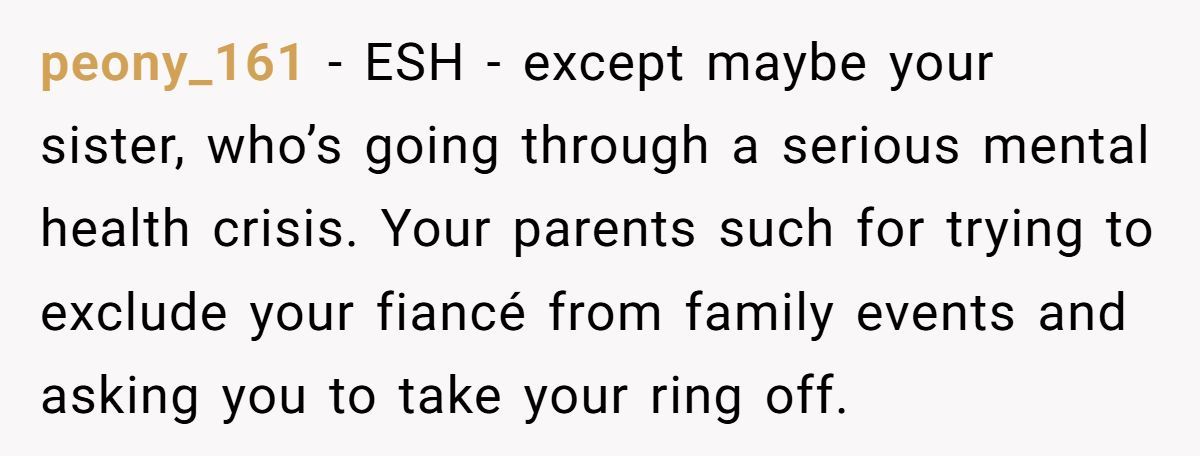 Family gatherings shouldn’t feel like walking on eggshells, but this Redditor’s engagement turned into a minefield! Her sister’s breakdown, fueled by a brutal breakup and competitive streak, prompted her parents to prioritize one daughter’s fragility over the other’s milestone. Asking the Redditor to hide her ring and exclude her fiancé was a misguided attempt to keep the peace, but it left her feeling erased. Her ultimatum—banning her parents from the wedding—escalated things, reflecting years of frustration with her sister’s favored status.