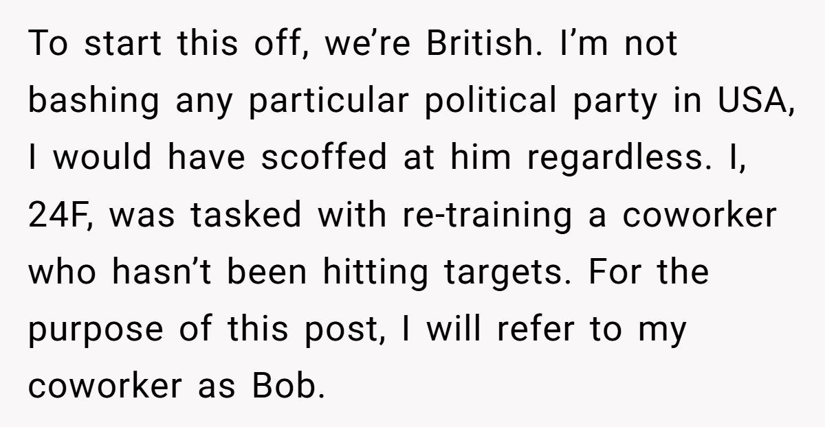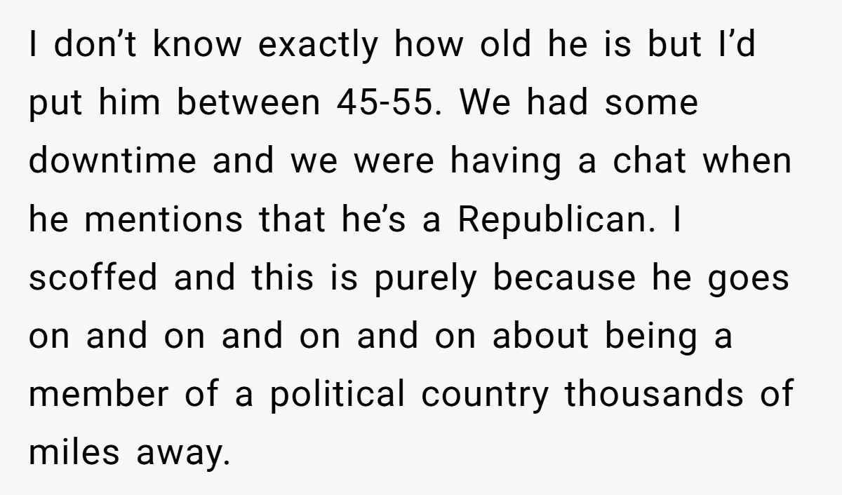 Office chatter can be unpredictable—but no one expects a full-on international political declaration over tea and performance targets. In this story, a British woman found herself face-to-face with her coworker’s unexpected confession: he identifies as a U.S. Republican. The twist? He’s never stepped foot in the States.