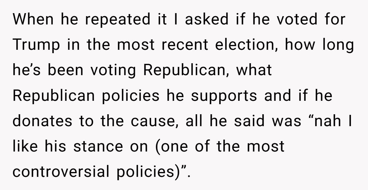 Still, when someone declares allegiance to a foreign party—particularly one as polarizing as the modern GOP—without engagement or understanding of the system, it comes across less like thoughtful ideology and more like cosplay. Add to that the coworker’s vague reasoning (“I like his stance on [redacted policy]”) and the lack of real political involvement, and it’s understandable why the woman found it amusing.