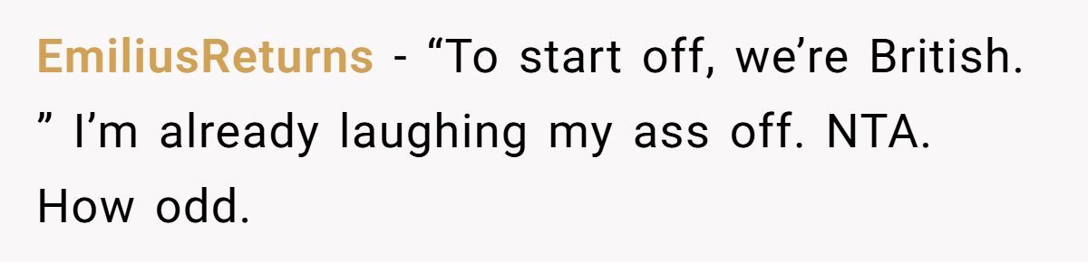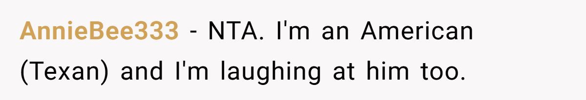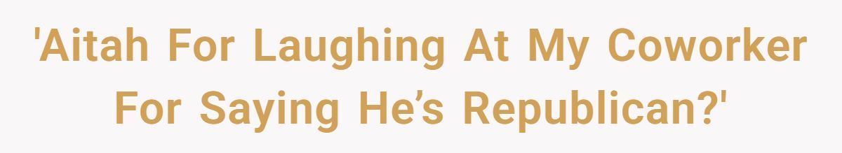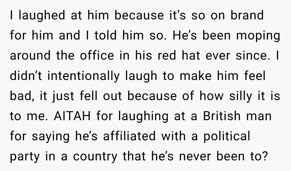 During a break, her coworker Bob proudly declared he’s a Republican—despite never leaving the UK or voting in a US election. It was bizarre, familiar, and hilarious … to her. She laughed. Now Bob mopes around with his red hat. Is she too harsh? Or did she call it like it is? Get the full thank-you-for-the-laughs breakdown below.