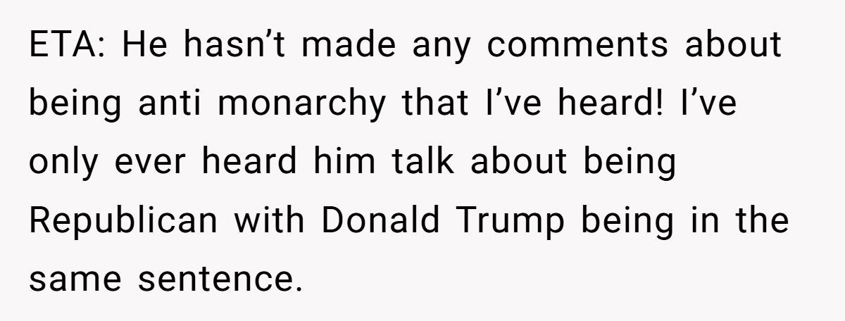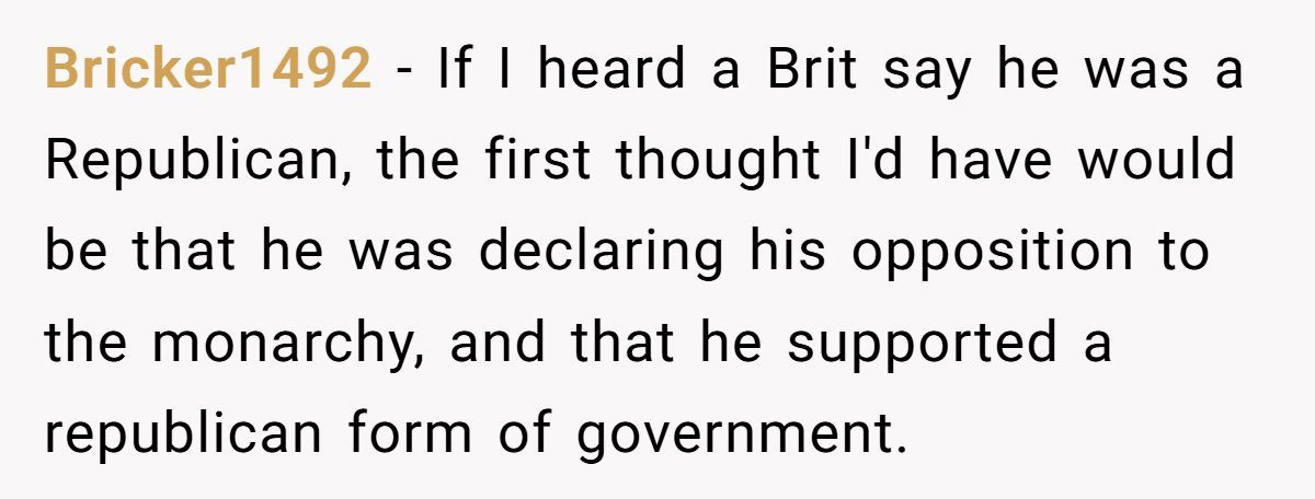These commenters claimed Bob’s Republican identity is laughable for a Brit, advising the Redditor not to feel guilty