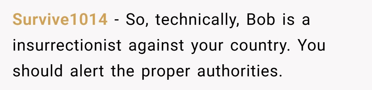 This commenter claimed Bob’s stance might signal insurrectionist views, advising the Redditor to alert authorities if serious